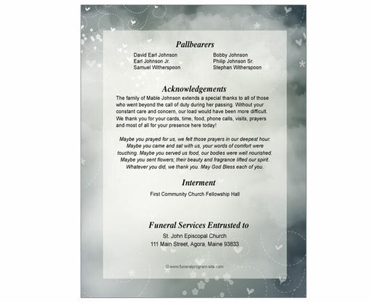 A funeral booklet should provide a meaningful tribute that honors and celebrates the life of the deceased while guiding attendees through the service. Common elements include the order of service, obituary, poems, hymns, and photos of the deceased. Many families also include personal messages, favorite quotes, or scripture verses that reflect their loved one’s beliefs and personality. A section for acknowledgments and expressions of gratitude allows the family to thank attendees for their support.