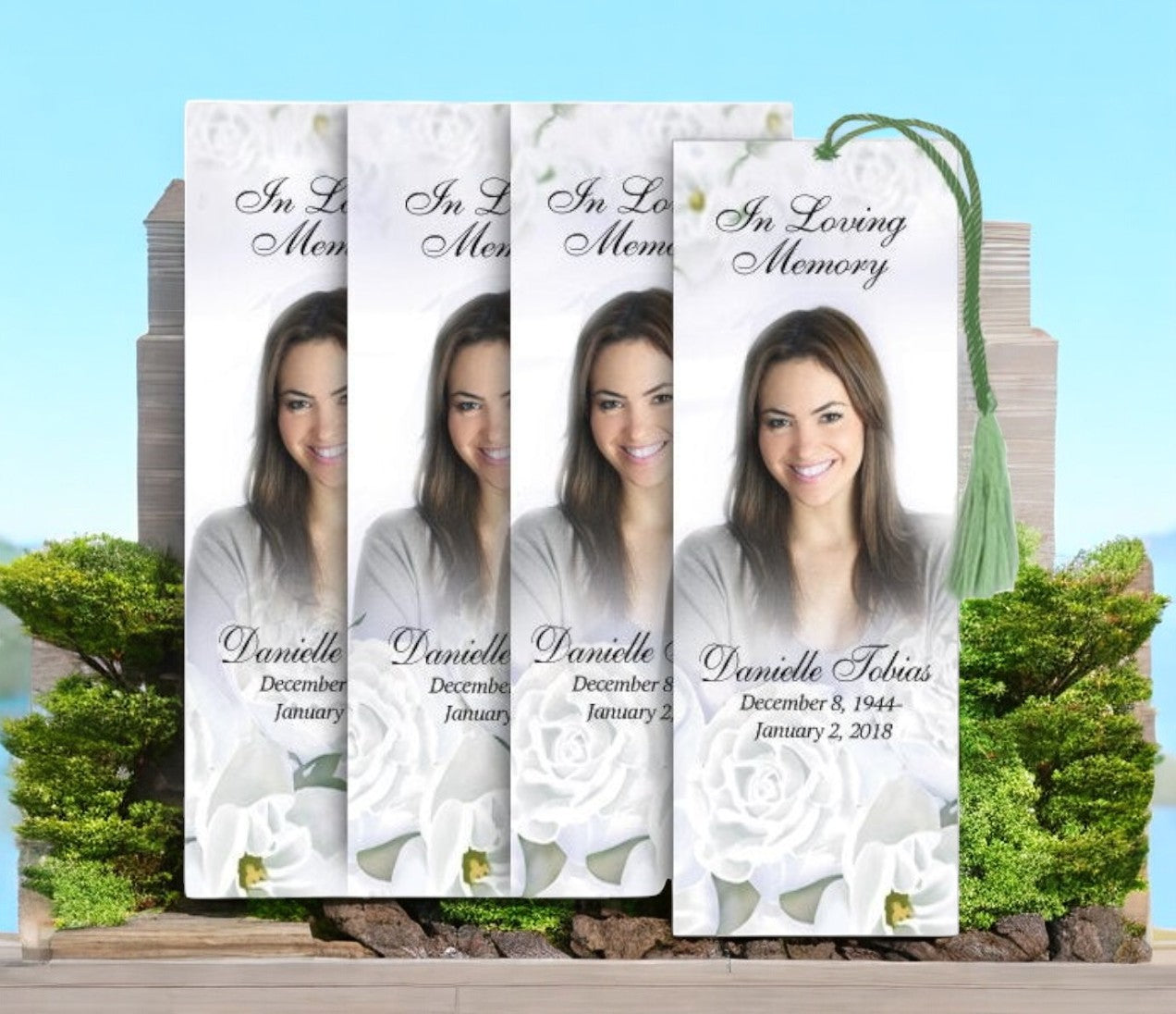 Our lovely white roses background sets these memorial bookmarks apart in our done for you memorial bookmark service. The elegant design of our memorial bookmarks is complemented by a high-quality printing process that ensures each detail is crisp and clear.