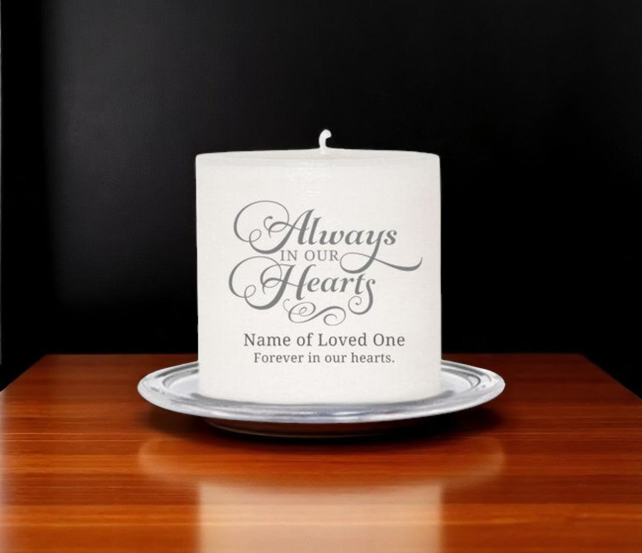 Crafted with care, the Always In Our Hearts Small Wax Memorial Candle provides a comforting glow, making it perfect for memorial services, anniversaries, or moments of reflection. The combination of elegant design and personalization ensures that this candle is a timeless reminder of the love and memories that will always remain in your heart.