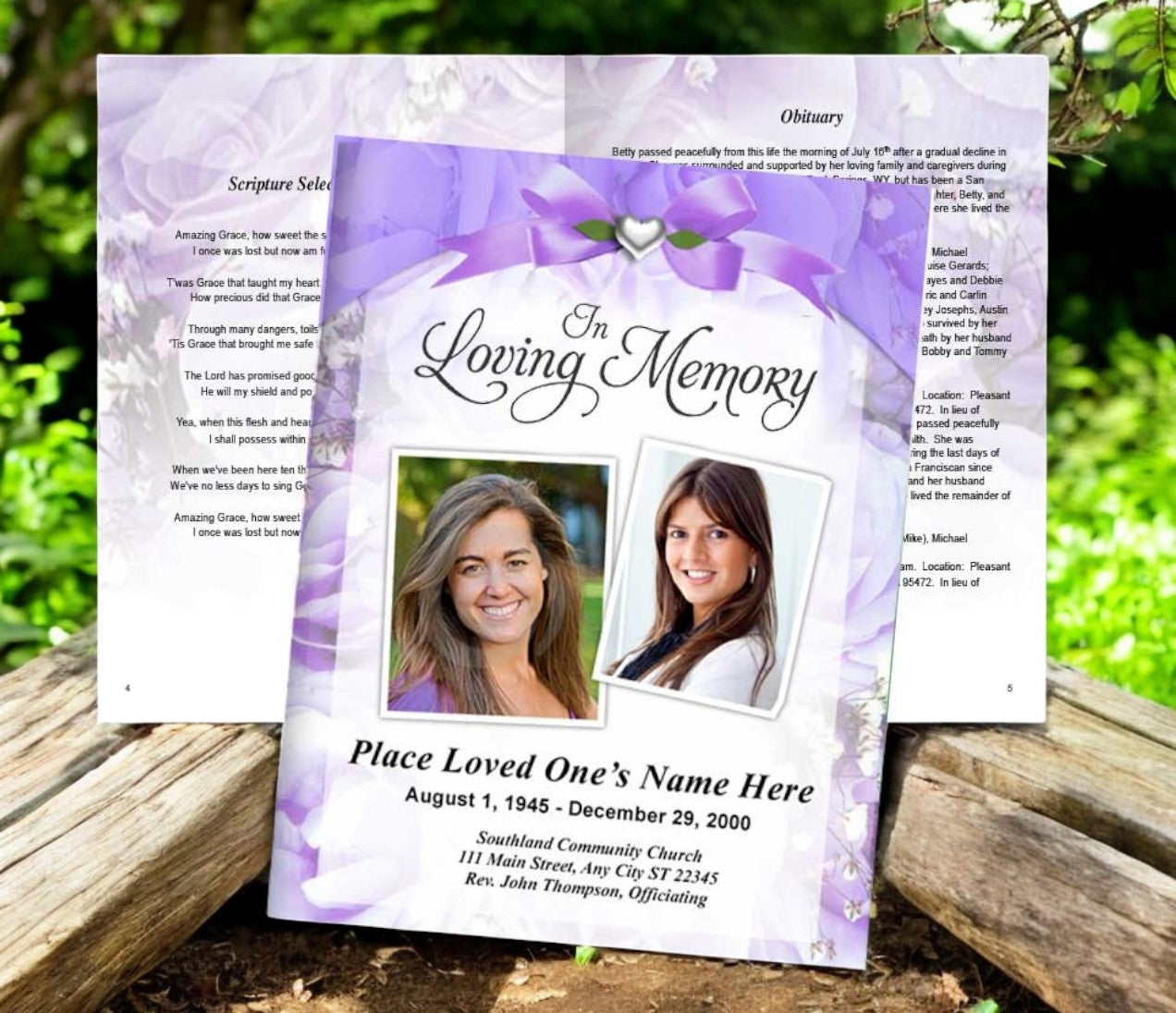This example provides 3 photos with background removal set on the cover of our popular Pathway funeral booklet design. Add as many inside pages as you need!