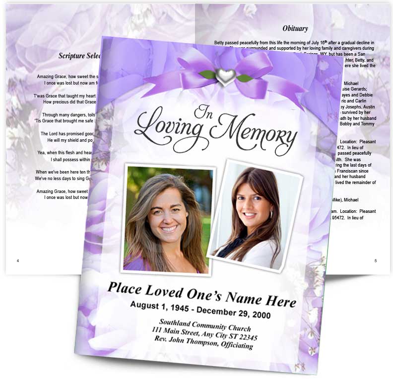 The Amethyst Funeral Booklet Template features an elegant floral design accented by a delicate bow and a silver heart, creating a timeless and heartfelt tribute. The soft amethyst tones add a sense of warmth and serenity, making this funeral booklet a beautiful way to honor a loved one’s memory with grace and love. The refined layout provides a dignified presentation, perfect for any memorial service.