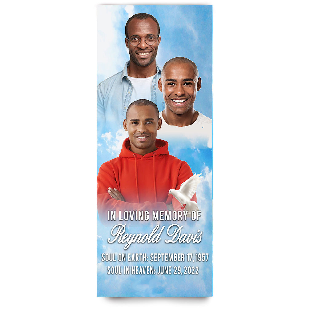 Your favorite photo(s) will be set upon our blue skies background for a heavenly display accented with a single white dove. Your photo background will be removed for a seamless integration. Submit your photo(s) along with 3 lines of personalized text. Your choice of Matte or Gloss Finish paper banner sheet. You can use tack or tape to adhere it to any surface or wall for the best presentation display. Measures 24" wide x 60" long or 2 ft. wide x 5 ft. long.