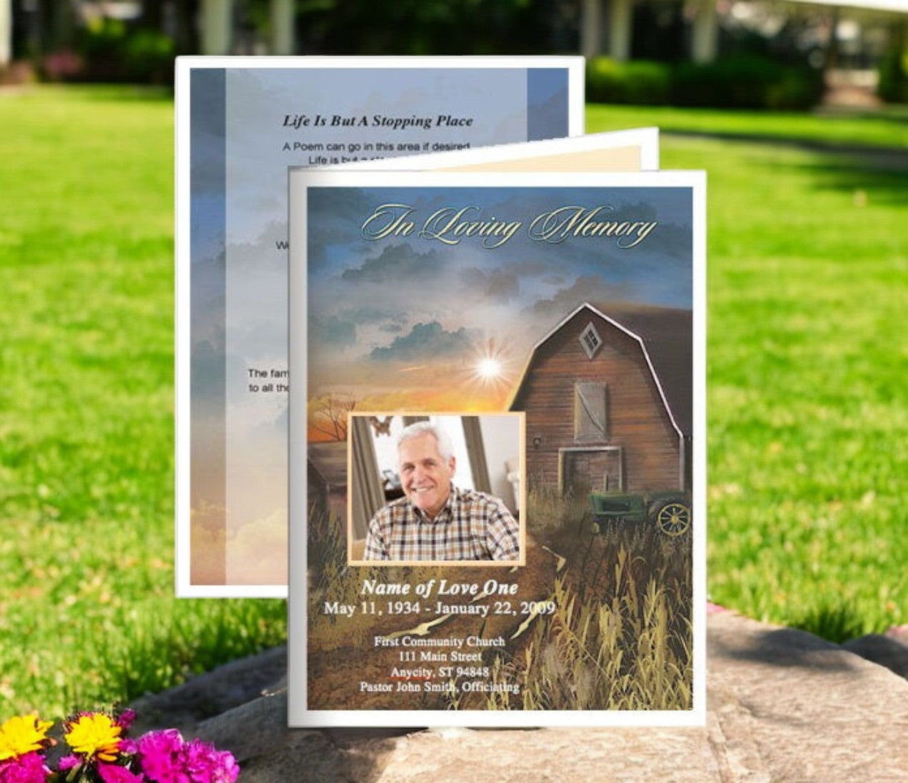 The Barn Small Memorial Card Template is a wonderful outdoor-themed funeral card design, featuring a charming barn and tractor. This design captures the essence of rural life, making the Barn Small Memorial Card Template a perfect choice for honoring someone who cherished the outdoors. The front design brings a sense of peace and connection to nature.