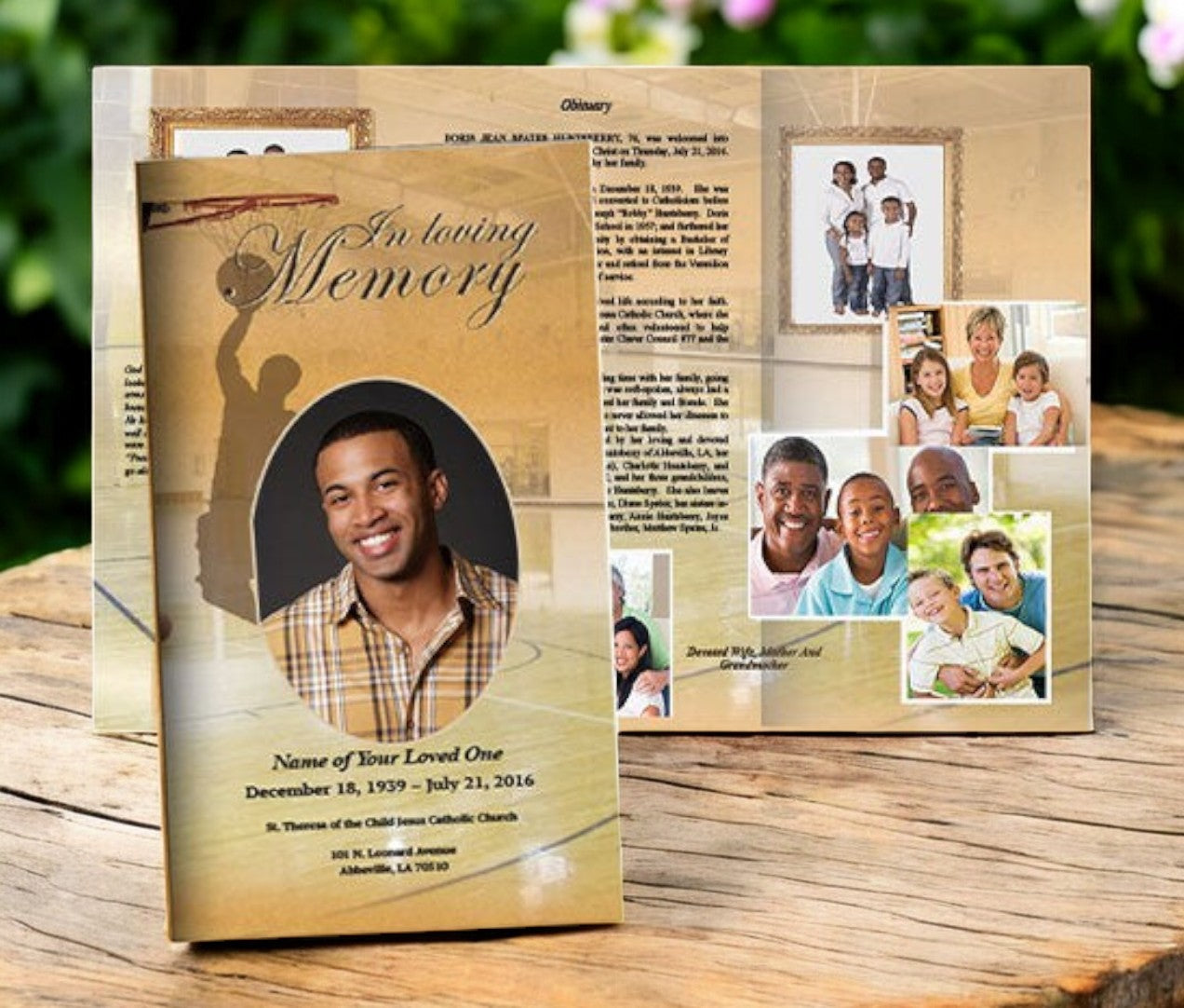 Our design from our sports themed background with golden basketball court and silhouette of player set behind your photo on the front cover. Your loved one’s photo prominently displayed within a preset frame in the center of the cover design amidst the skies landscape inspired background.