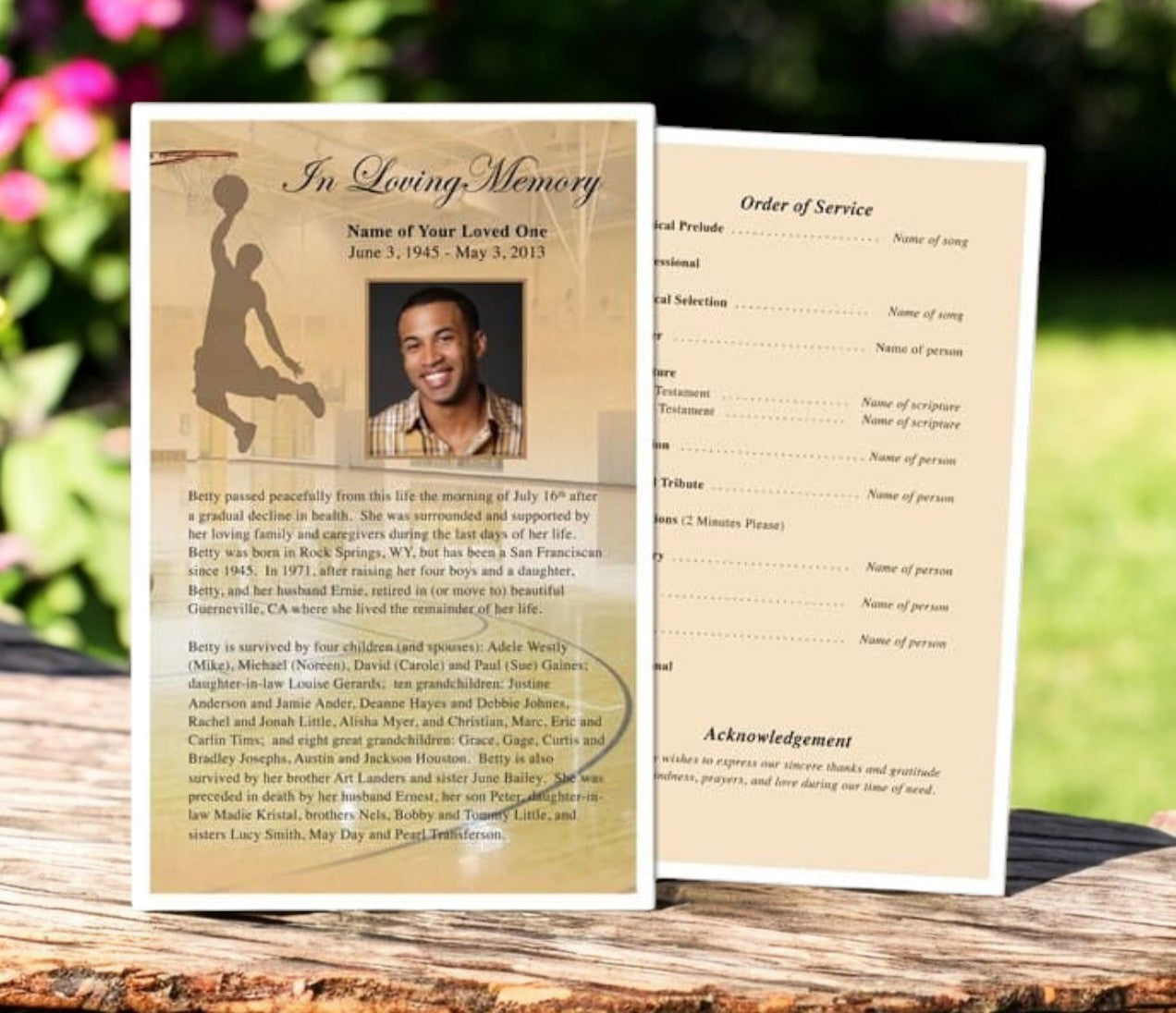 The Basketball Funeral Flyer Template features a thoughtful basketball-themed design, making it a fitting tribute for a player, coach, or devoted fan. This half-sheet template captures the passion for the game while honoring a loved one’s memory in a meaningful way. The Basketball Funeral Flyer Template provides customizable space for service details, personal messages, or inspirational quotes, allowing families to create a unique and heartfelt keepsake.