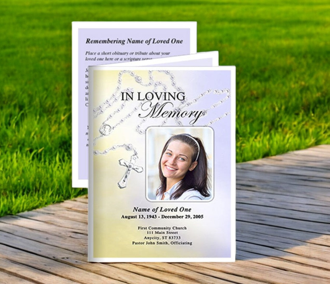 The Beads Small Memorial Card Template features a beautiful Catholic-themed design, with a beaded rosary on the front, symbolizing faith and devotion. This thoughtful design makes the Beads Small Memorial Card Template a meaningful choice for honoring someone who held their faith close. The delicate rosary imagery adds a comforting touch to the card, making it a fitting tribute.