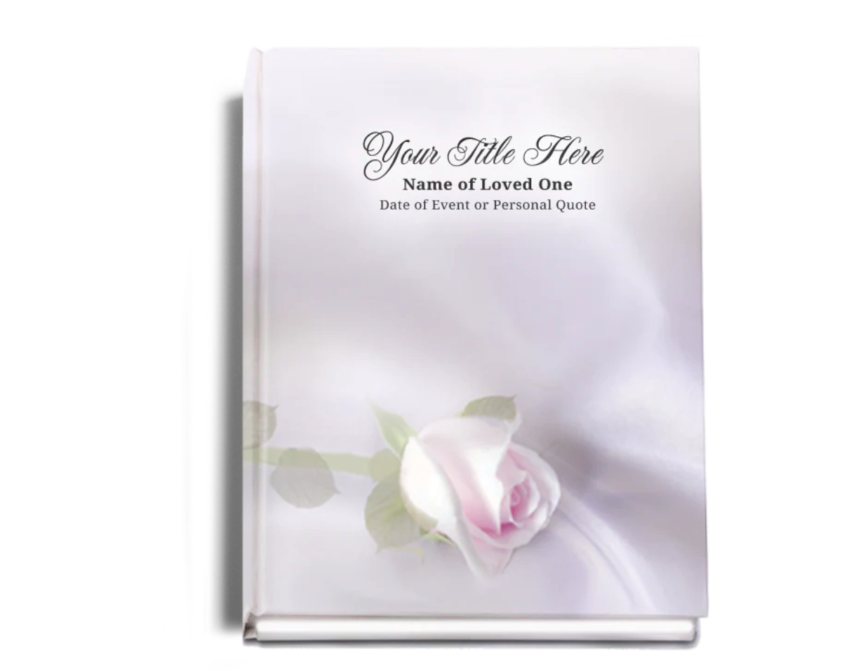 The Beloved Funeral Guest Book features an elegant design with a single soft pink rose resting against a soft lavender satin background. This serene and beautiful design provides a peaceful space for guests to leave their heartfelt messages, creating a comforting atmosphere during a time of remembrance. The Beloved Funeral Guest Book is a perfect tribute, offering both grace and sentiment as it honors the life of a cherished loved one.