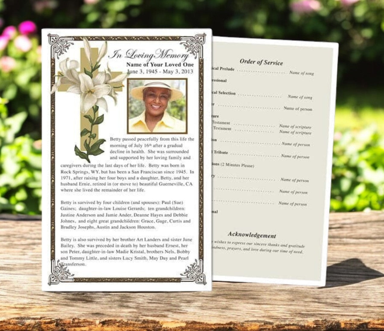 The Bethany Funeral Flyer Template features a stunning white lily cross set against a serene spiritual background, symbolizing purity, faith, and remembrance. This elegant design provides a heartfelt tribute, making it a meaningful choice for honoring a loved one’s life and legacy. The Bethany Funeral Flyer Template offers customizable space for service details, personal messages, or inspirational scriptures, allowing families to create a unique and thoughtful keepsake.