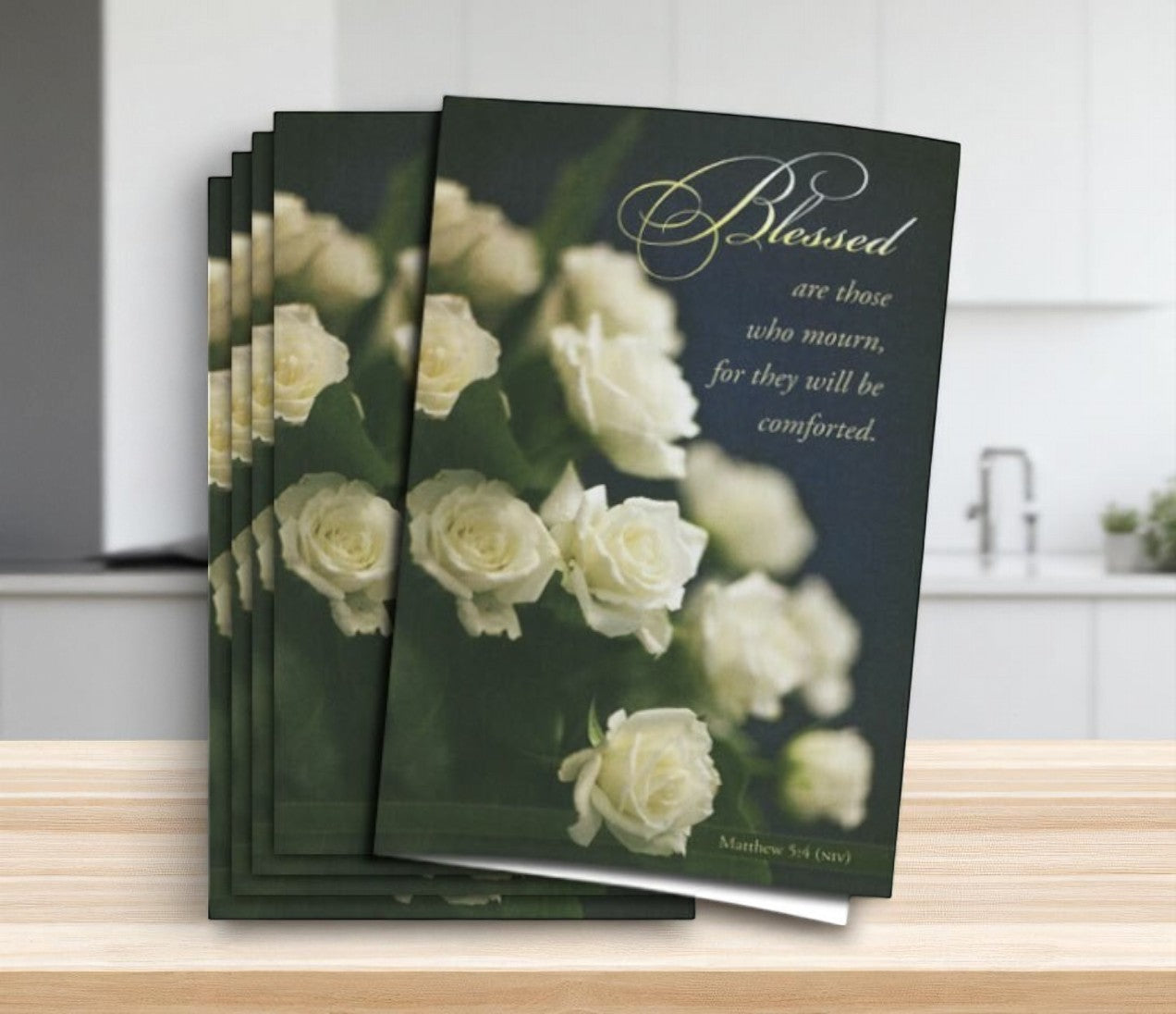 The Blessed Are Those Funeral Program Paper presents a comforting and faith-filled design, perfect for memorializing a loved one with grace and reverence. The soft background and peaceful imagery create a serene space for sharing memories, complemented by the heartfelt scripture from Matthew 5:4: “Blessed are those who mourn, for they shall be comforted.”