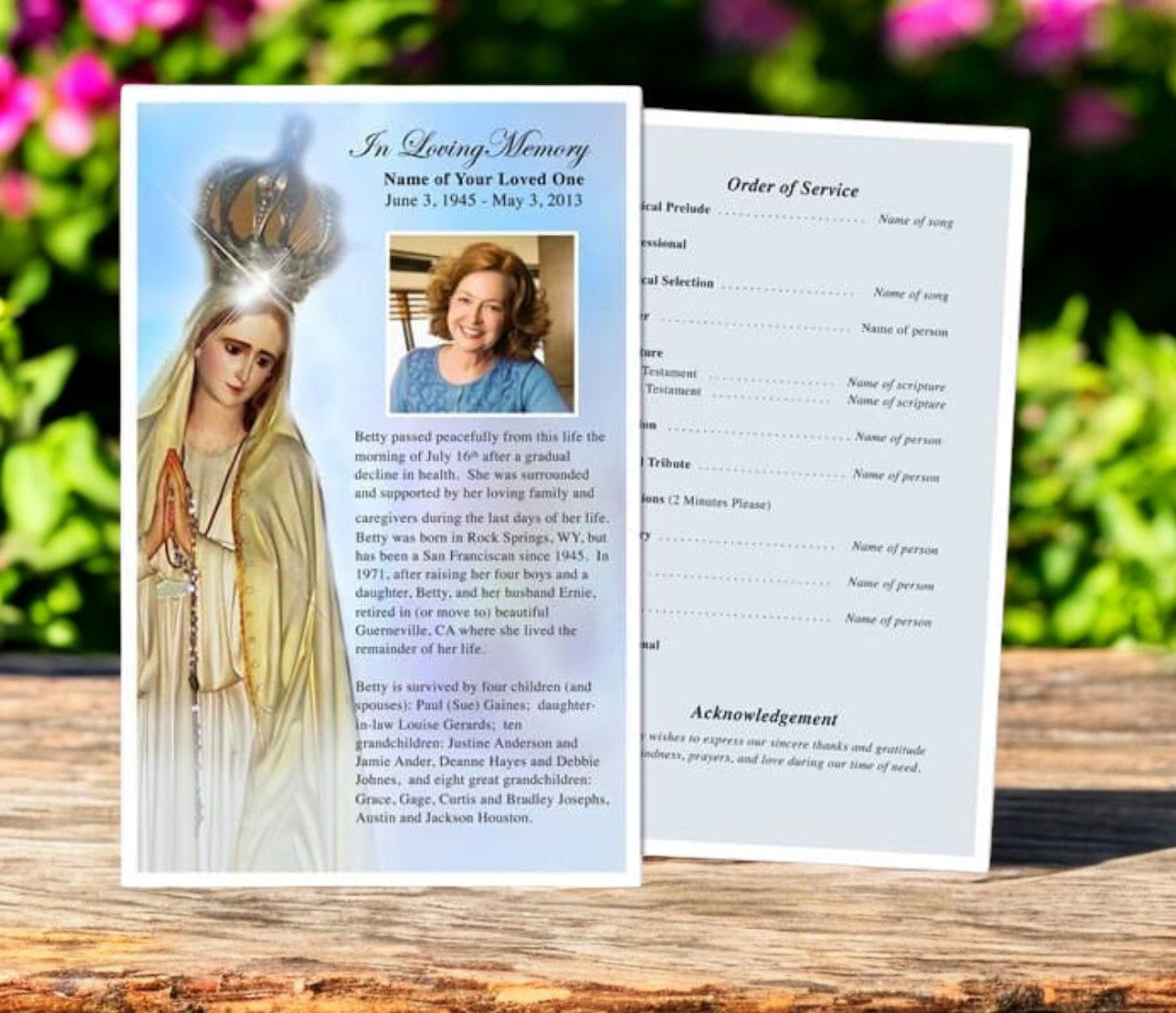 The Blessed Funeral Flyer Template features a serene Catholic-themed design, showcasing a depiction of the Blessed Mother against a soft blue background. This graceful and faith-inspired layout provides a meaningful tribute, making it a perfect choice for honoring a loved one’s devotion and spiritual legacy. The Blessed Funeral Flyer Template includes customizable space for service details, personal messages, or sacred prayers, allowing families to create a heartfelt and memorable keepsake.
