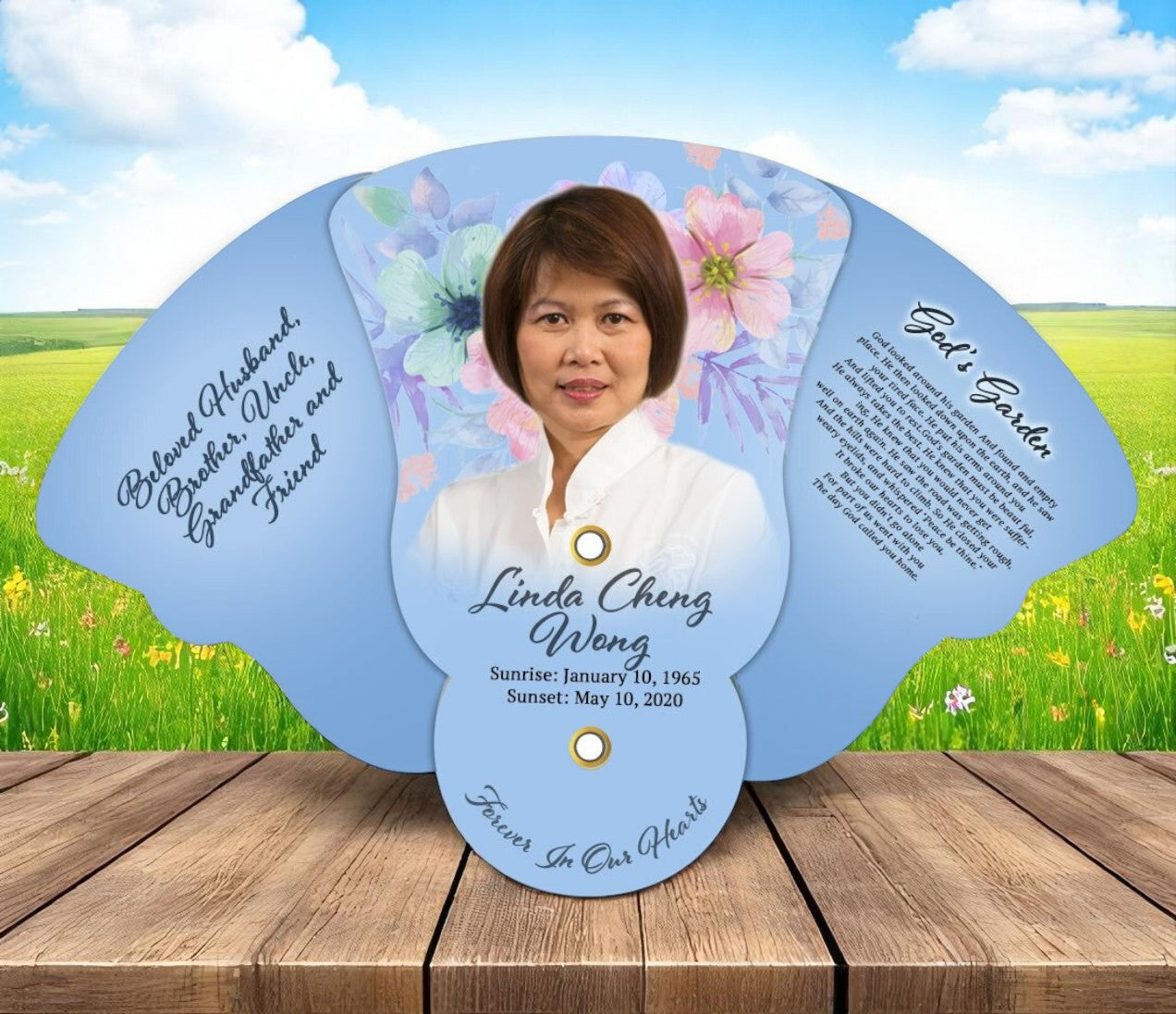 The Blue Florals Folding Memorial Fan features a gentle light blue background that graces the left and right panels of this elegant folding hand-held fan. The Blue Florals Folding Memorial Fan offers a soft and calming design, perfect for bringing a touch of tranquility to any memorial service. Its subtle blue tones provide a serene setting that honors a loved one’s memory with quiet beauty.