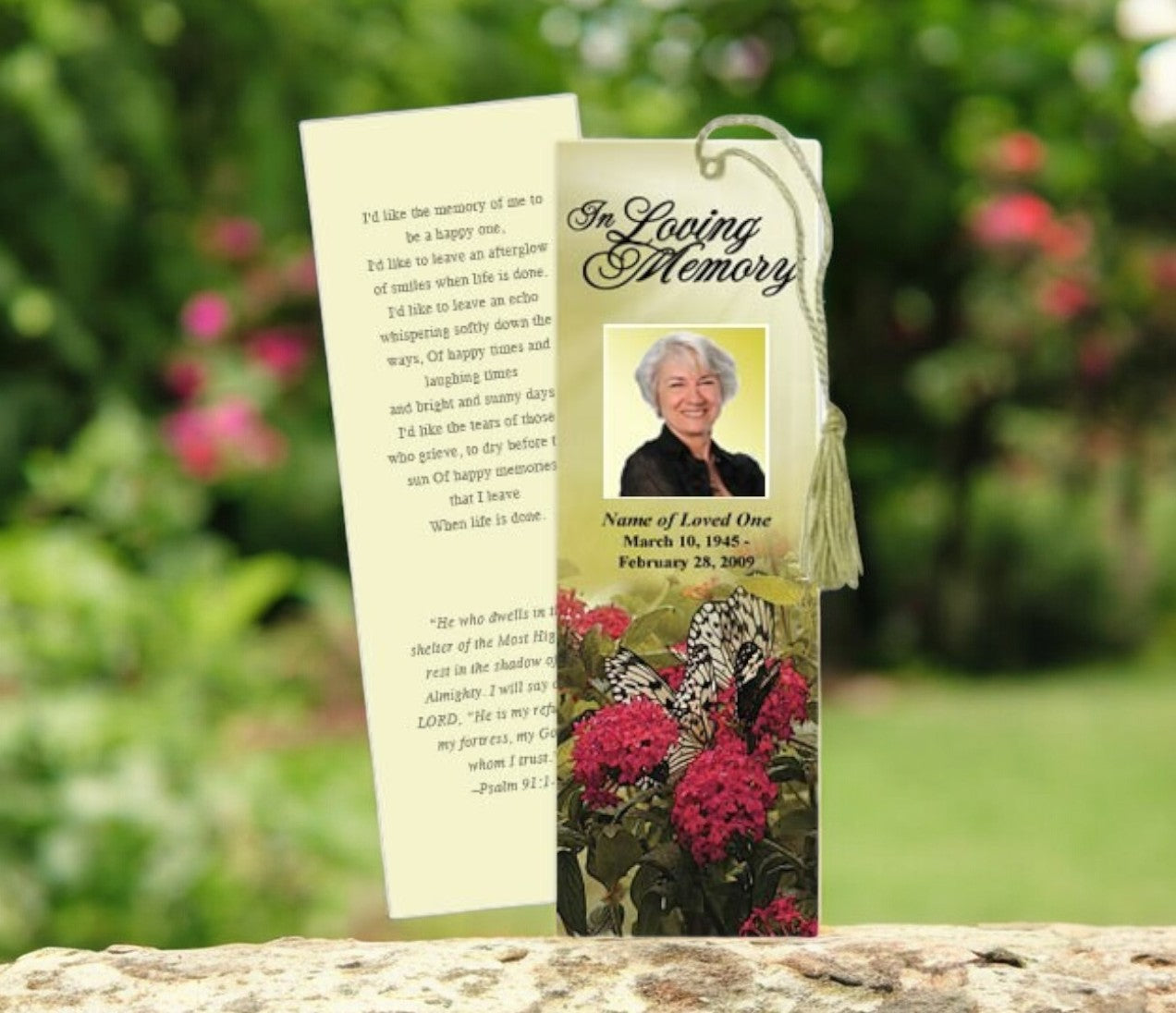 The Bouquet Memorial Bookmark Template features a soft bouquet of red flowers accented by delicate butterflies set against a beautifully golden-lit background. This elegant design symbolizes love, remembrance, and the beauty of life, making it a meaningful tribute for a loved one’s memory. The template allows for customization, with the option to place a loved one’s photo in either a rectangular or oval frame on the front or back, adding a personal and heartfelt touch.
