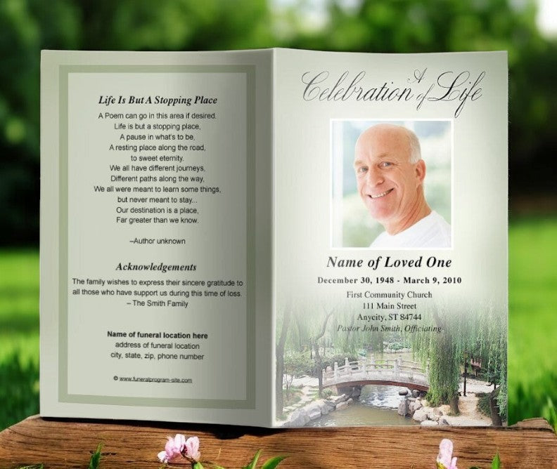 A lovely setting displaying a perfect bridge over calming waters set with lush trees and natural landscape is the theme for this funeral program template design. The back continues with a coordinating gradient design with transparent frame overlay with soft bordering ready to contain poems and family acknowledgement information. The inside displays a complimentary background design with content area.