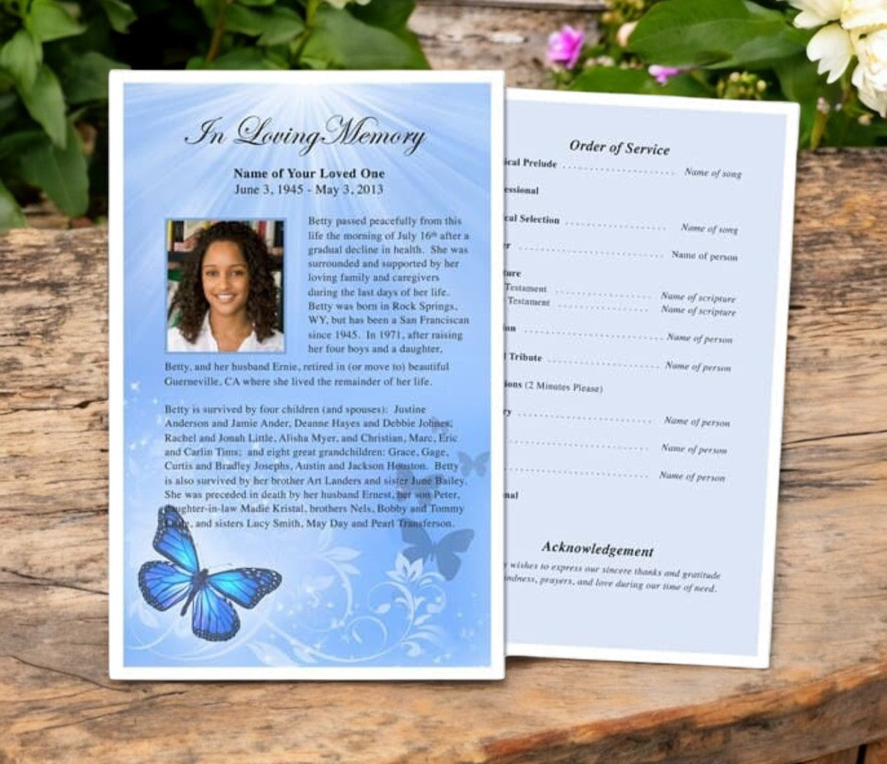 The Butterfly Funeral Flyer Template features a serene design with beautiful blue butterflies fluttering beneath a bright floral light background. This delicate and symbolic layout represents transformation, peace, and remembrance, making it a meaningful tribute to honor a loved one’s memory. The Butterfly Funeral Flyer Template provides customizable space for service details, personal messages, or heartfelt quotes, allowing families to create a unique and cherished keepsake.