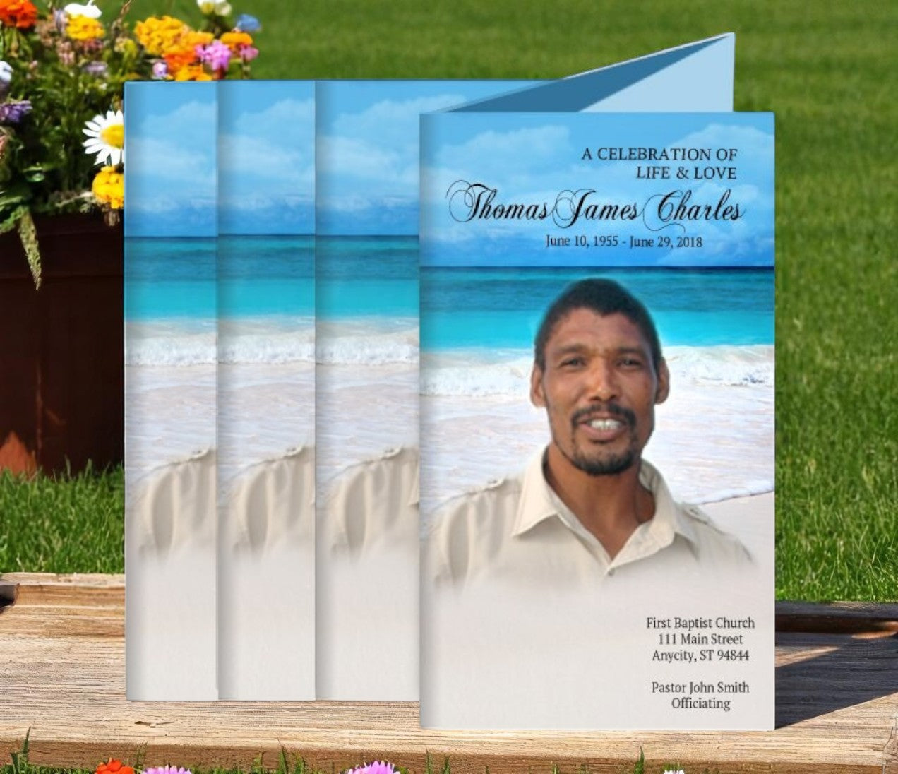 The Caribbean Funeral Brochure Design & Print is designed in a six-panel trifold layout, providing space for an obituary, service details, poems, and personal reflections. The soothing beach theme creates a heartfelt and tranquil keepsake that honors a life remembered with warmth, peace, and natural beauty.