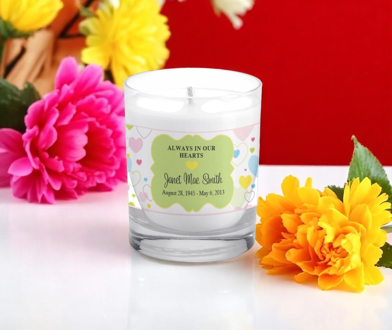 The Carolina Personalized Memorial Votive Candle features a lovely heart variety background, showcasing hearts of all shapes and sizes. The design is accented with a softened frame at the center, which contains your chosen text information, making it a truly personal and heartfelt tribute. This thoughtful design allows you to customize the candle with meaningful words that honor your loved one.