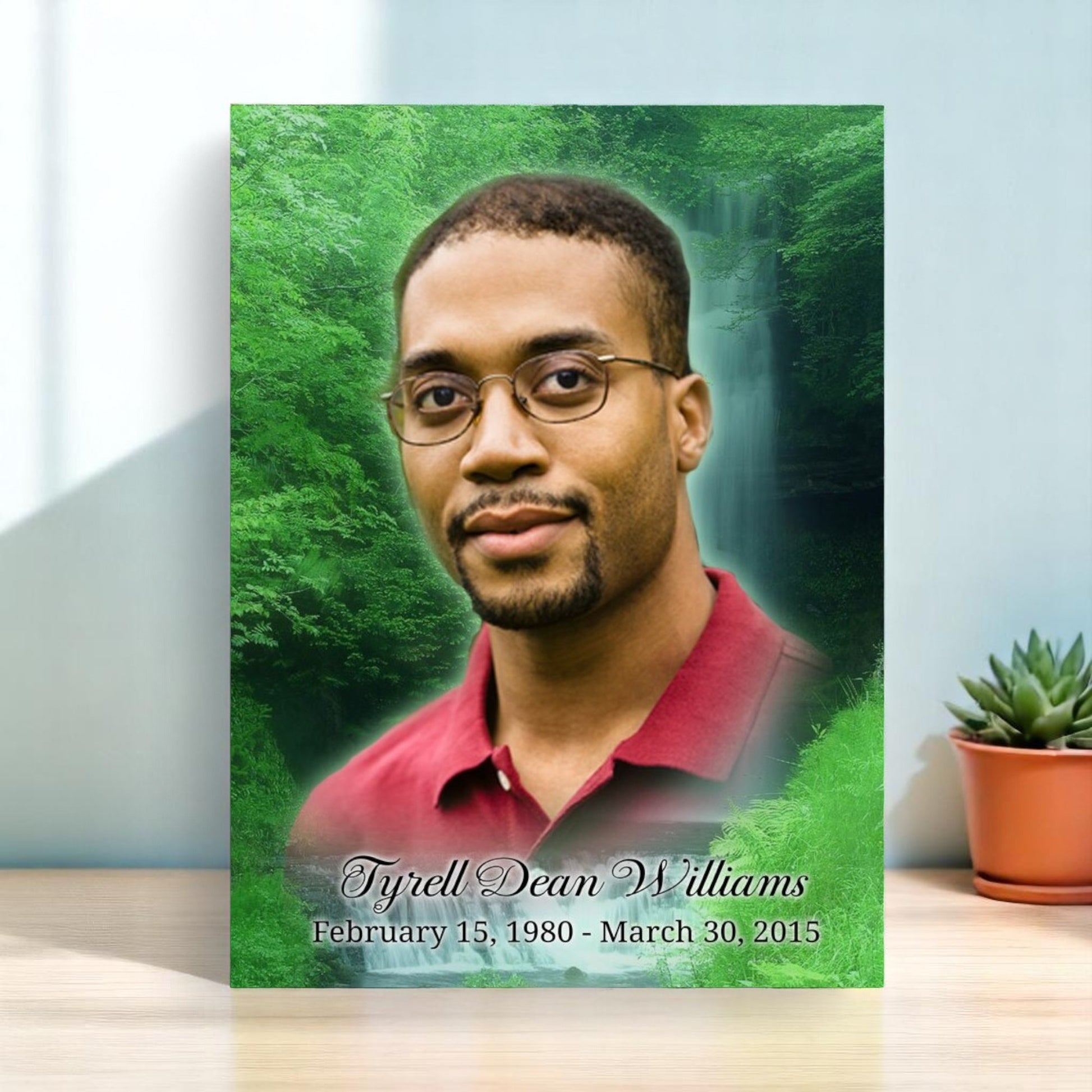 The Cascade Funeral Memorial Poster Portrait features a lush outdoor background with gracefully flowing waterfalls, creating a serene and peaceful tribute. This beautiful design provides a calming and tranquil backdrop for your loved one's photo, symbolizing the flow of life and the peace they have found. The Cascade Funeral Memorial Poster Portrait offers a meaningful way to honor their memory in a setting that evokes nature's beauty.