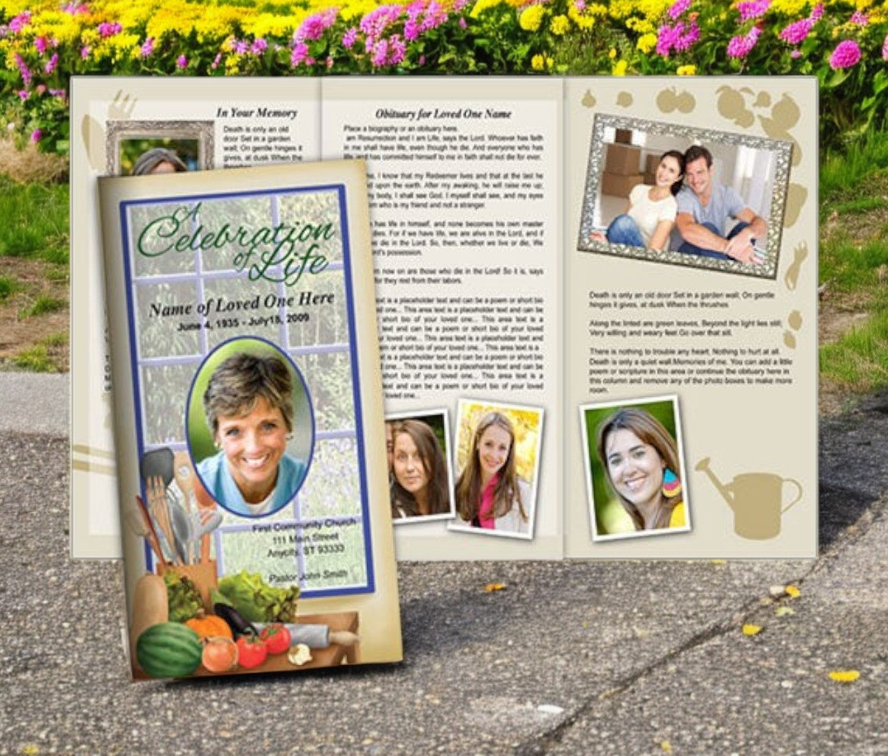 A great funeral program template design for the loved one who was a chef at heart or loved to cook. This design illustrates kitchen utensils with fruits and vegetables on a table beside a scenic window. Your loved one’s photo prominently displayed within an oval frame in the center of the cover design amidst the heavenly created background.
