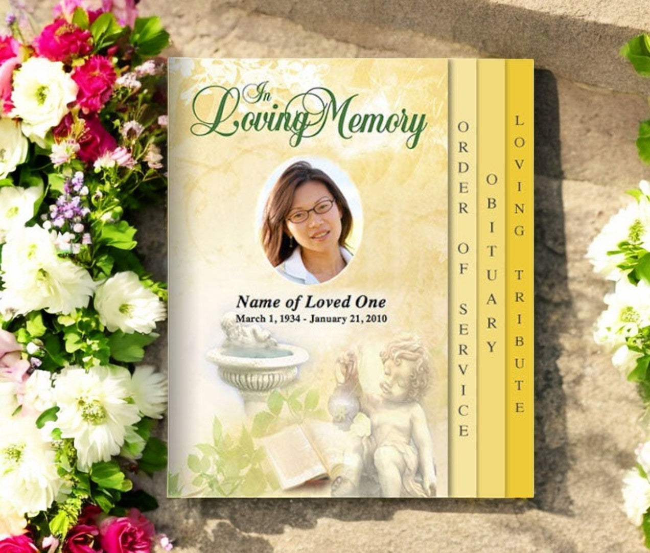 Designed for ease of use, the Cherub 8-Sided Graduated Program Template includes a coordinating back layout with a white transparent overlay, ideal for showcasing personalized service details. This template provides a structured and refined format, making it a meaningful keepsake for attendees. Its delicate cherub theme adds a touch of grace and remembrance to any service.