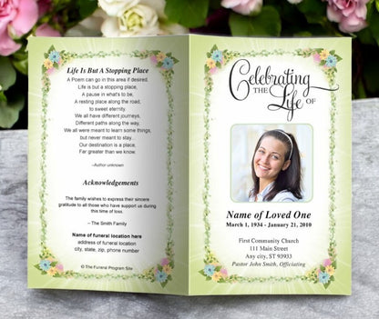 A beautiful, soft floral designed framing with lovely pink florals lining the corners amidst a sparkling soft green ray background. The back of the funeral program continues the floral background design with beige overly that is perfect for a poem or short obituary/biography. The inside displays a complimentary background bordered design which can display your content information.