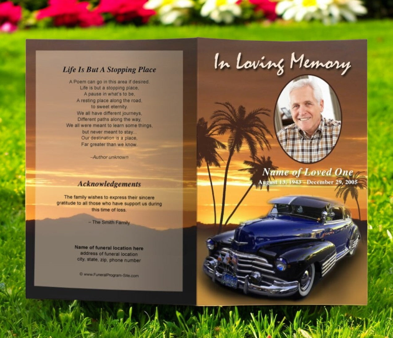 This obituary program offers a very cool vintage classic car set in front of a golden, tropical background with amazing sunset skies. The back is a coordinating design with transparent overlay ready to contain a poem, acknowledgements, and funeral service location information. The inside displays a complimentary background colored frame with content area.