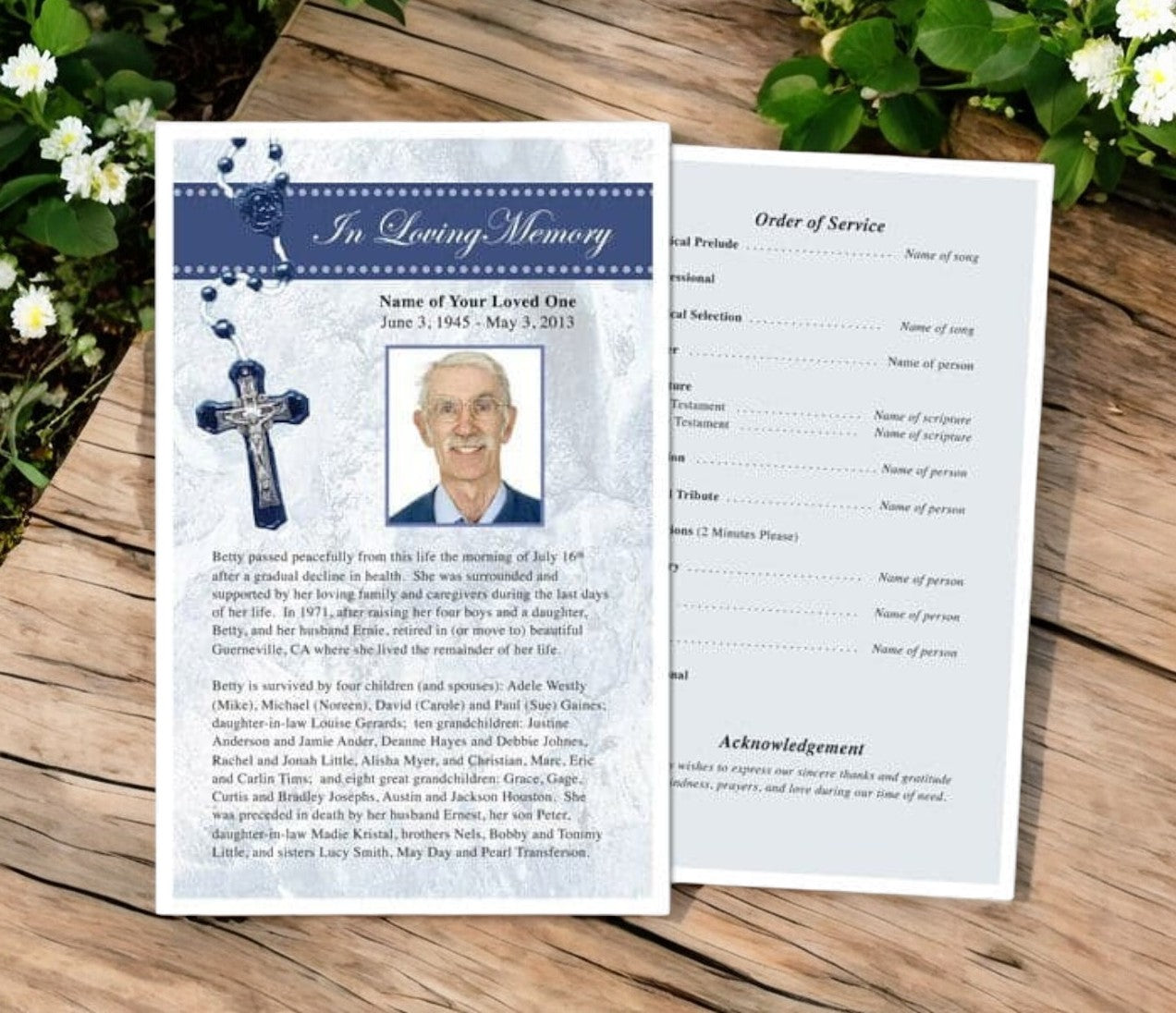 Need help putting your information and photos into this. template? Our add-on customization service provides the assistance you need. We completely typeset your entire program for you and insert all of your photos, resulting in a professional presentation. A perfect option if you are short on time or need to tend to other details of the funeral service.