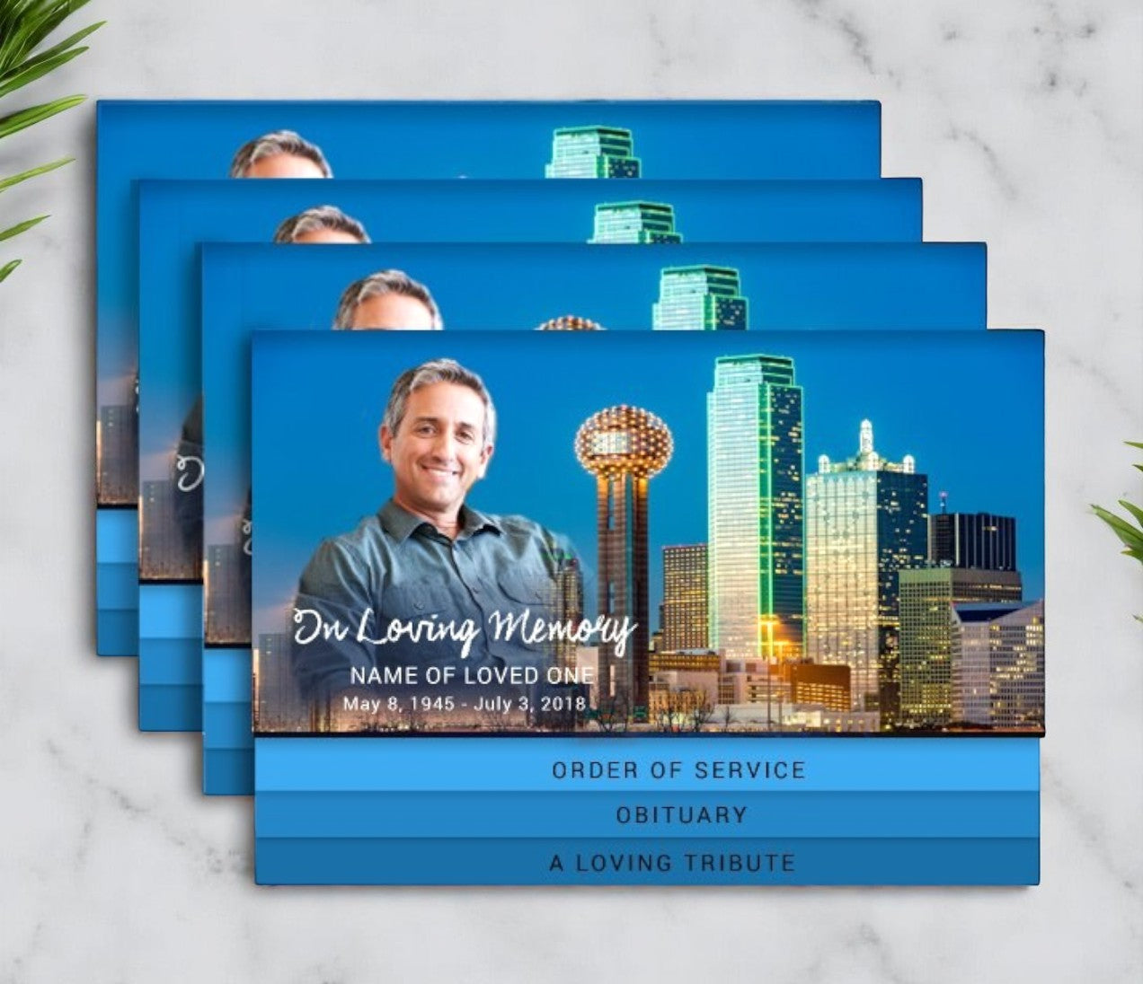The Dallas 8-Sided Graduated Bottom Funeral Program Design & Print showcases a striking cityscape backdrop featuring the iconic skyline of Dallas, Texas. This design is a fitting tribute for a loved one who was proud to call Dallas home or held special memories tied to this vibrant city. The urban landscape creates a dignified and personal setting for commemorating a life rooted in this region.