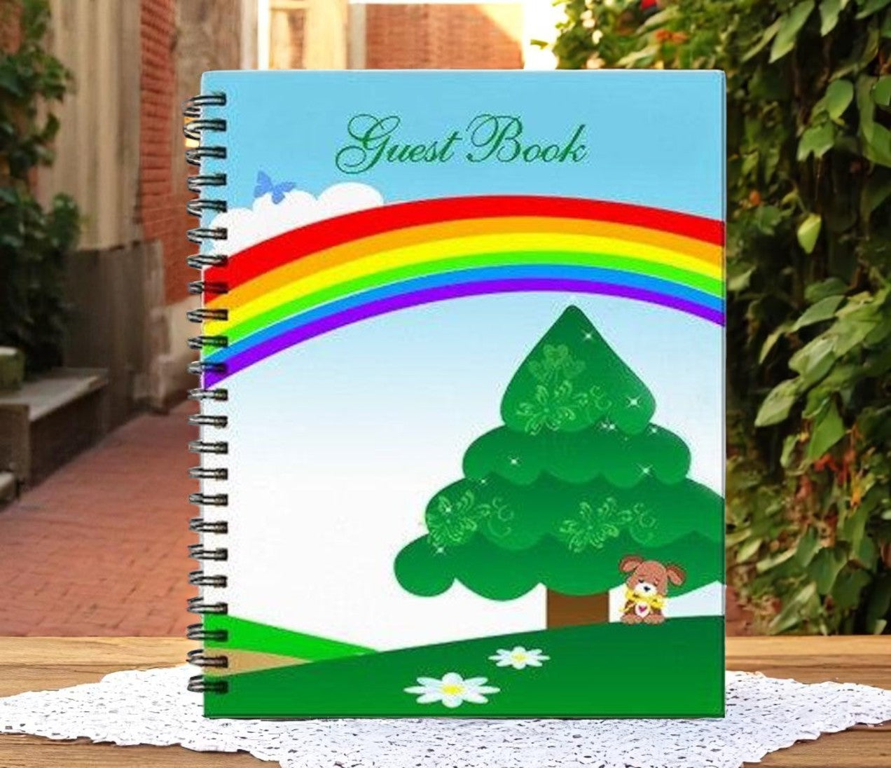 The Delight Wire Bind Funeral Guest Book features a whimsical and playful outdoor youth scene that fills the air with joy. This wire-bound, hardcover glossy memorial guest book provides a serene and uplifting space for guests to leave their heartfelt messages, offering comfort and remembrance during a memorial service. The playful outdoor scene in the Delight Wire Bind Funeral Guest Book symbolizes youth, innocence, and the enduring spirit of a loved one.