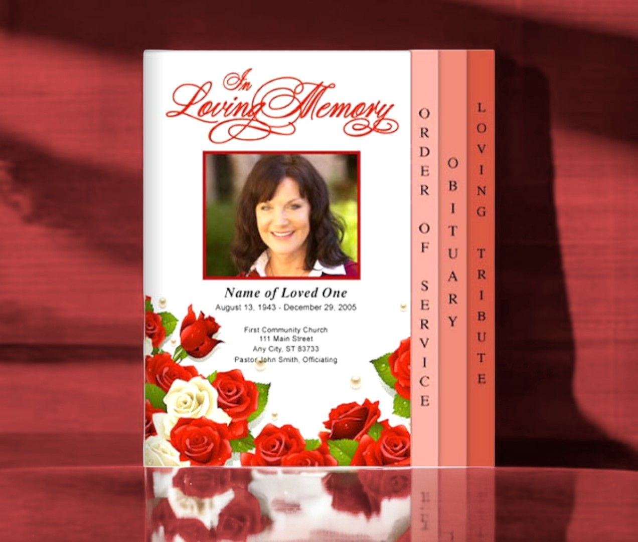 The Diva 8-Sided Graduated Funeral Program Template features a stunning yet simple design, elegantly adorned with red roses and pearls along the bottom edge. Set against a clean white background, this sophisticated layout provides a timeless and graceful tribute to a loved one. The classic floral and pearl elements add a touch of beauty and refinement, making it a meaningful keepsake for family and friends.