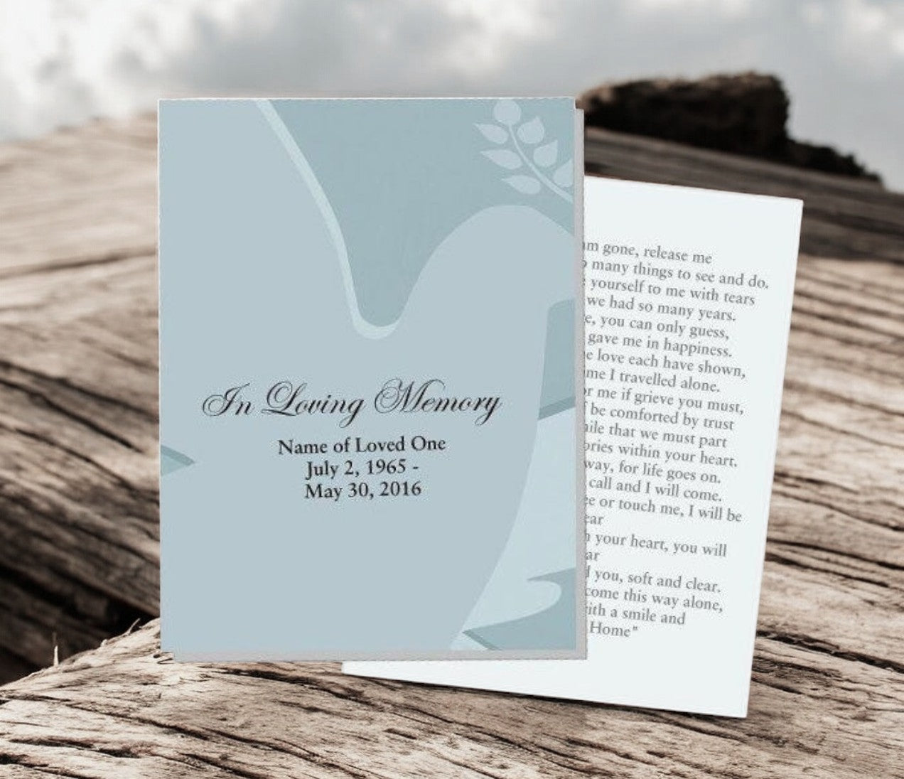On the back of the Dove Small Memorial Card Template, there is a text box for adding a personalized message or tribute. The soft coordinating solid background color enhances the overall design, creating a soothing and harmonious look. The Dove Small Memorial Card Template is a beautiful way to honor and remember a loved one with grace and spiritual significance.