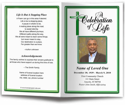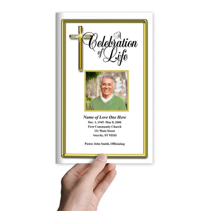 This regal and golden design is simple, crisp, and elegant with the shiny embossed frames around each section of the program. A sparkling golden cross sits to the top with a gold rimmed frame around your loved one's photo. The back continues the clean design perfect to fit any poem, acknowledgement, or scripture information. The inside displays a coordinating colored background lined with a white dotted frame.