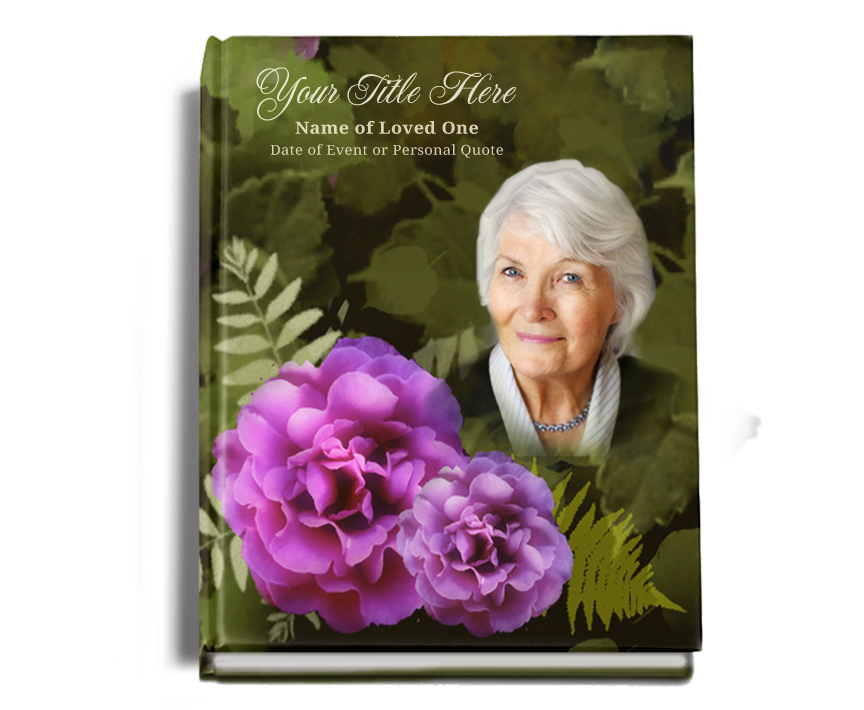 The Essence Funeral Guest Book features the blossom of two beautiful lavender/pink florals amidst ivy and green foliage, gracing the beauty of this elegant design. This guest book creates a serene and floral atmosphere, offering a comforting space for guests to leave their heartfelt messages. The soft colors and natural elements of the Essence Funeral Guest Book provide a peaceful tribute, perfectly suited for memorial services.