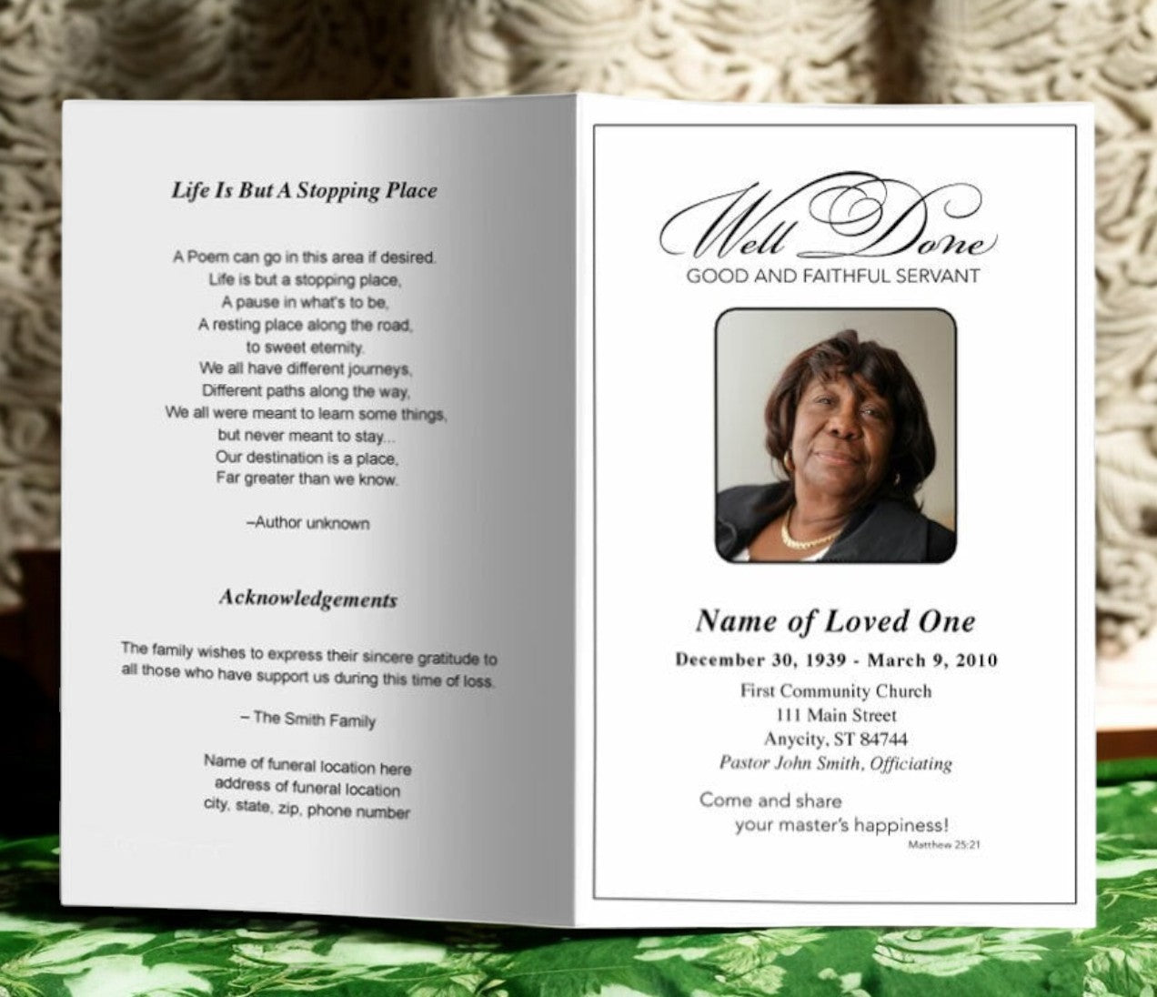 A faith based design with our word art which reads "Well done good and faithful servant" bible verse on the front cover. We've designed this program so that you are able to print this on any color paper while keeping a clean, simple, and professional presentation. A cost effective solution to color printing, this template allows you to place any color or black and white photo on the front cover.