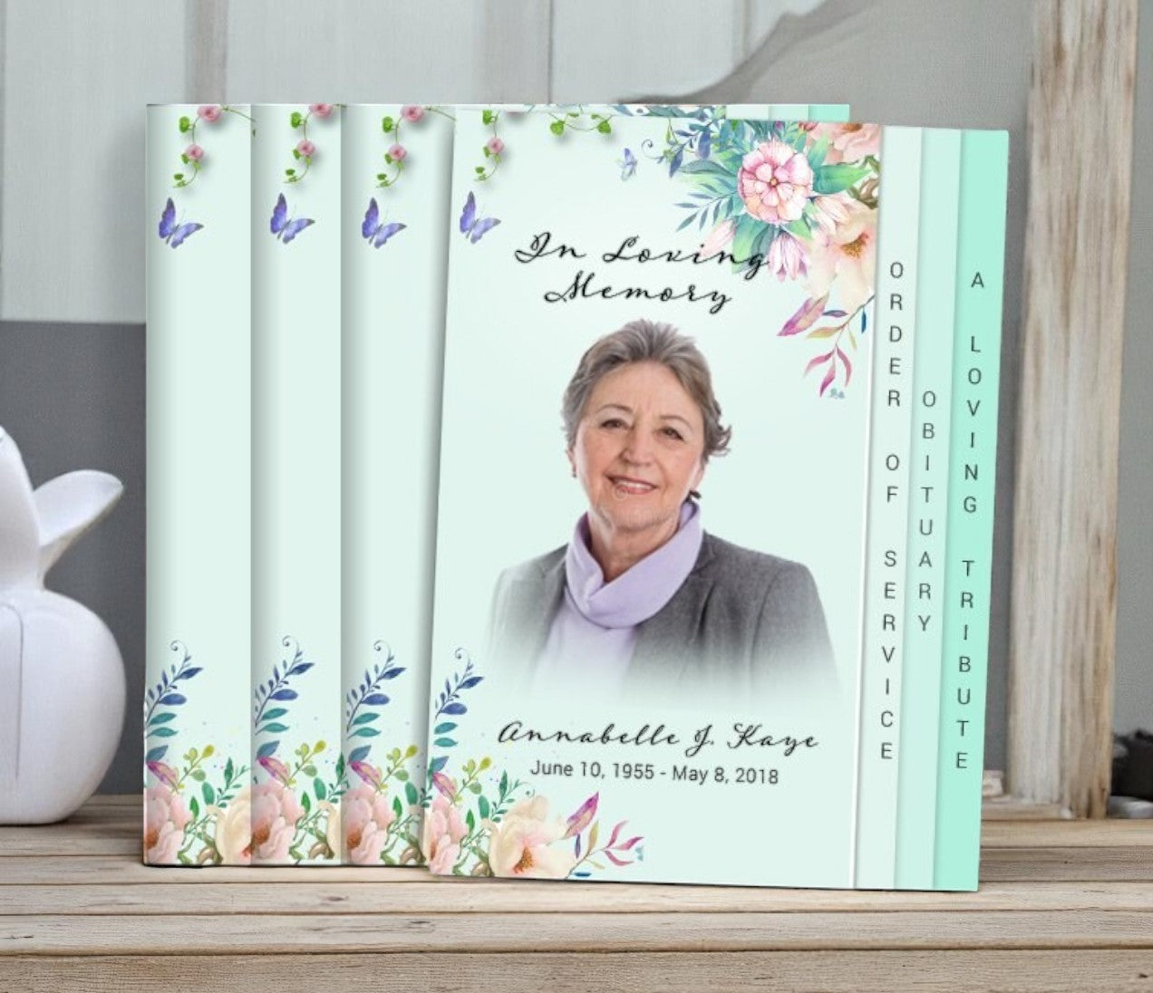 The Floral Inspire 8-Sided Graduated Funeral Program Design & Print offers a delicate and graceful design with soft pastel tones and gentle floral elements. Subtle flower accents adorn two corners of the layout, accompanied by tiny butterflies that symbolize transformation and peaceful remembrance. This layout brings a light and soothing aesthetic, creating a comforting atmosphere for honoring a loved one.