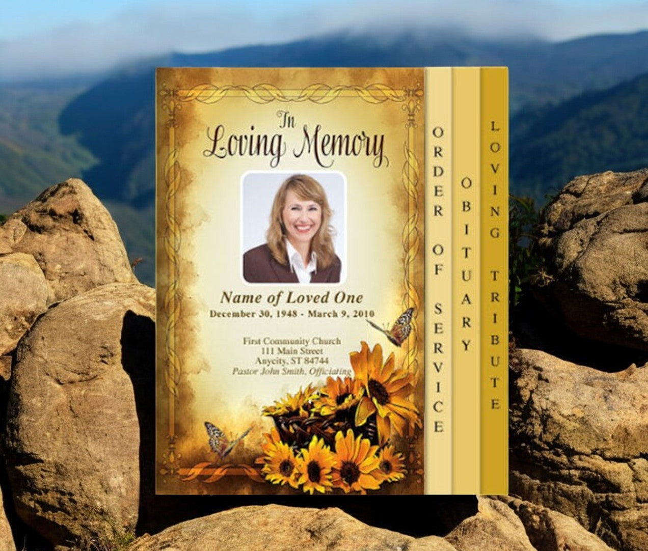 The Genesis 8-Sided Graduated Funeral Program Template features a beautifully framed design adorned with sunflowers in a basket and delicate butterflies hovering nearby. This warm, golden-themed layout provides a radiant and uplifting tribute, symbolizing remembrance, hope, and the beauty of life. The elegant framing offers a professional and polished presentation, making it a meaningful keepsake for family and friends.
