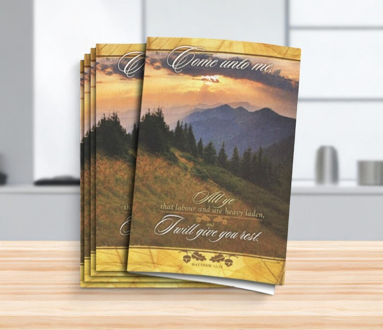 The Give You Rest Funeral Program Paper features a peaceful mountainside view with majestic peaks resting beneath soft coral skies. This tranquil landscape evokes a sense of calm and reflection, creating a serene space to honor a loved one’s memory. The natural beauty of the scene offers a comforting backdrop for your personalized tribute.