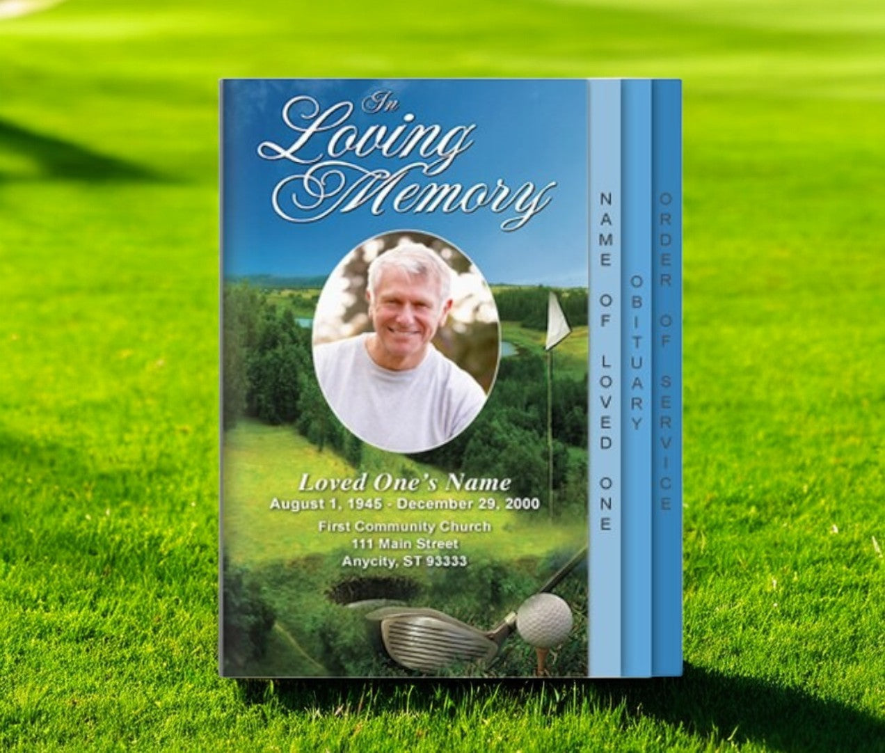The Golfer 8-Sided Graduated Program Template features a beautifully designed golf-themed tribute, set against a scenic golf course with lush putting greens, a tee, and a golfer silhouette. This elegant and personalized layout is the perfect choice for honoring a loved one who had a passion for golf. The serene landscape and thoughtfully crafted design provide a heartfelt way to celebrate their love for the game and their cherished memories on the course.