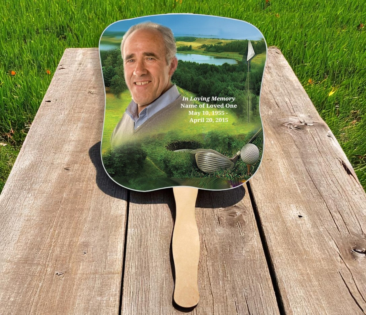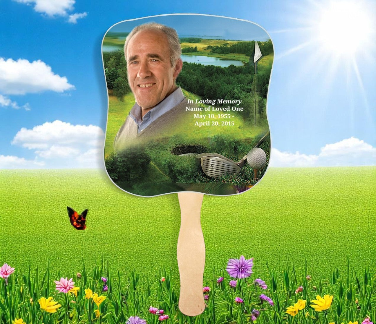 The Golfer Memorial Fan With Wooden Handle features a picturesque golf course scene complete with a serene small lake and a lush putting green. The Golfer Memorial Fan With Wooden Handle is a perfect tribute for someone who loved the game of golf, capturing the peaceful beauty and leisure of the course. This thoughtful design brings a sense of relaxation and fond remembrance to any memorial service.