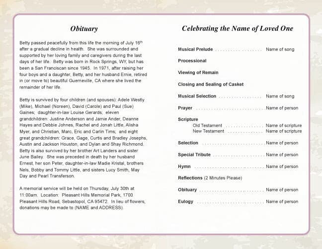 Need help putting your information and photos into this. template? Our add-on customization service provides the assistance you need. We completely typeset your entire program for you and insert all of your photos, resulting in a professional presentation. A perfect option if you are short on time or need to tend to other details of the funeral service.