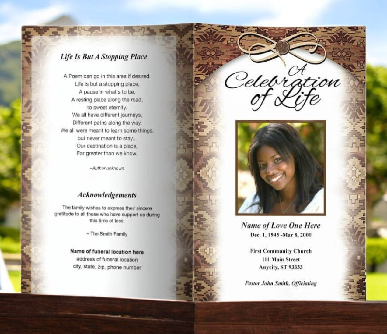 This obituary funeral program template displays motifs and the cultural fabric lining the borders within its design. The back continues a similar design with white transparent overly. The inside displays a complimentary background design with white inset framed content area.