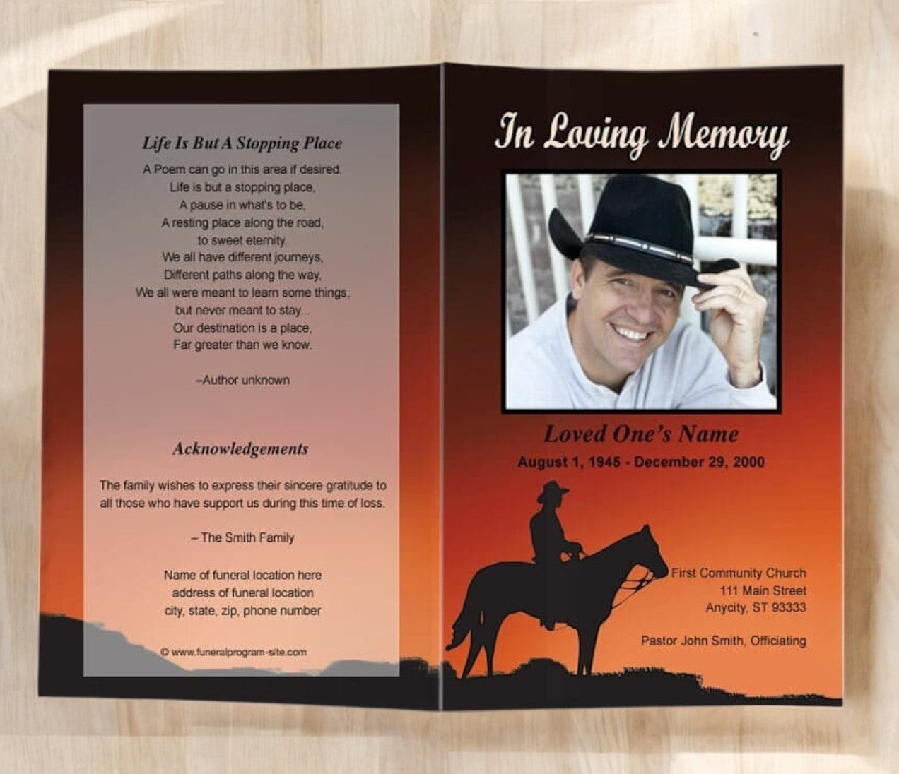 A rider on horseback sits upon a distant hilltop overlooking the sunrise is portrayed in this western themed program design. Your loved one’s photo is prominently displayed amidst the background. Place more pictures on the inside pages, if desired. The back of the funeral program template continues the western themed design.
