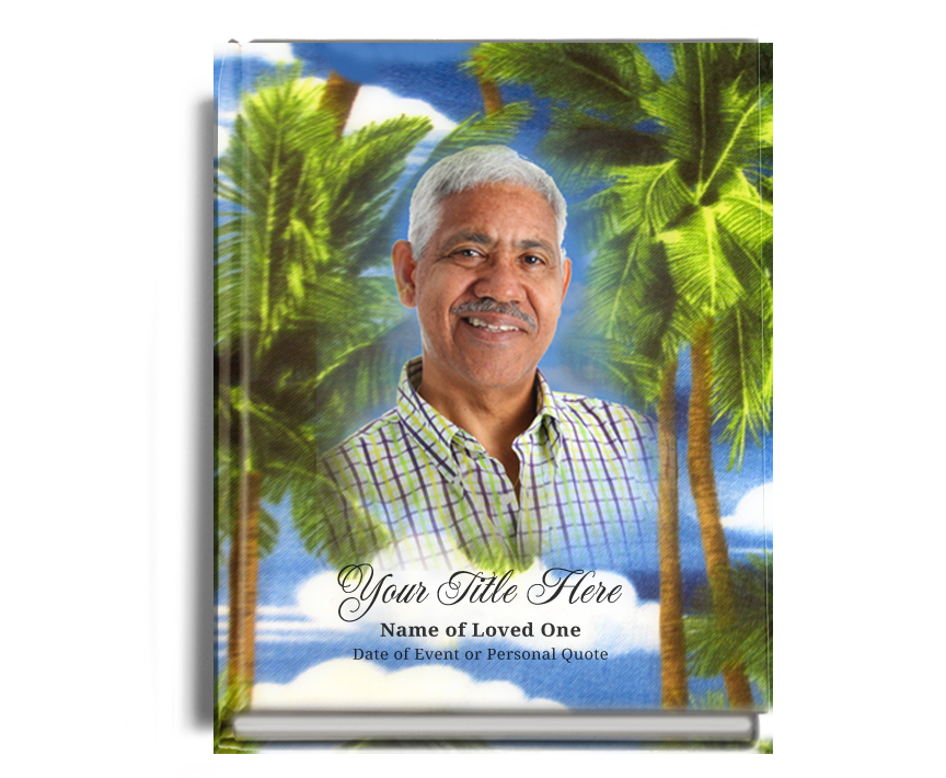 The Paradise Funeral Guest Book features a serene island setting with the sway of tropical palm trees on a clear summer day. This paradise-inspired design offers a peaceful space for guests to leave their heartfelt messages, creating a calming atmosphere during a memorial service. The tropical palm trees and bright sky in the Paradise Funeral Guest Book symbolize peace, tranquility, and the beauty of nature.