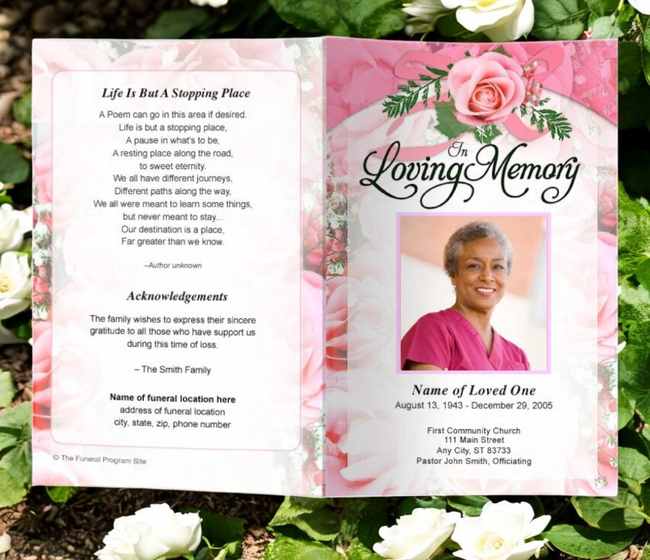 A beautiful array of peach roses line the front and back with a beautiful floral and ribbon embellishment on the front cover of this funeral template. The back of the funeral program continues with a coordinating background design with white transparent overly that is perfect for a poem or short obituary/biography. The inside displays a complimentary background layout design.