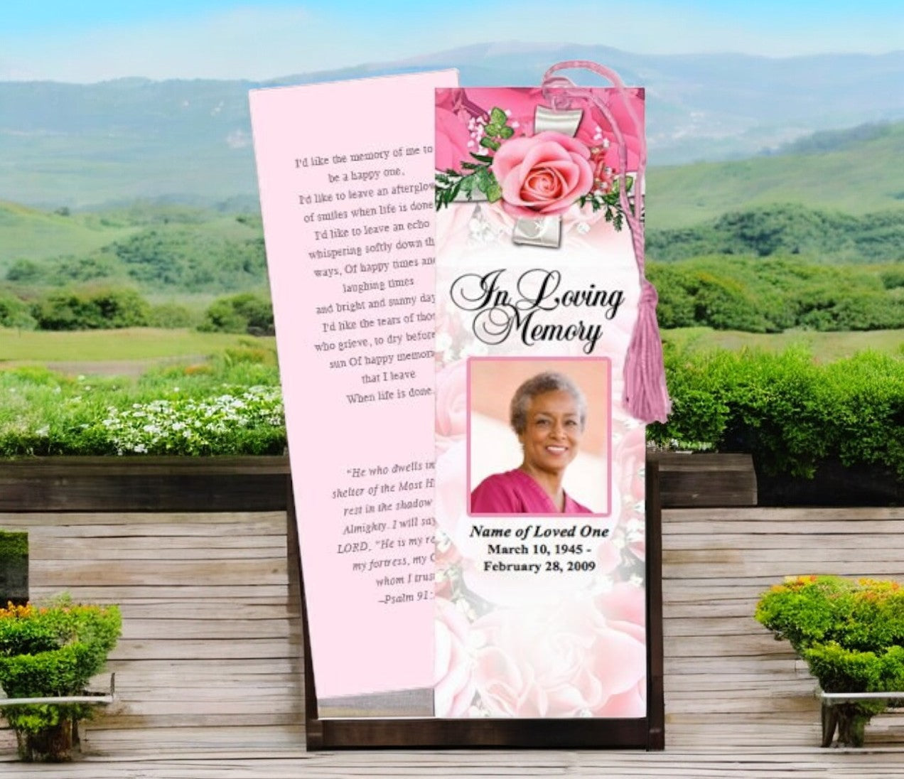 The Precious Memorial Bookmark Template features a delicate and heartfelt design, showcasing soft pink roses gracefully lined along the front. A budding pink rose, accompanied by baby's breath and a flowing ribbon, adorns the top, adding a gentle and elegant touch. This serene floral arrangement symbolizes love, remembrance, and the beauty of cherished moments, making it a meaningful tribute for honoring a loved one.