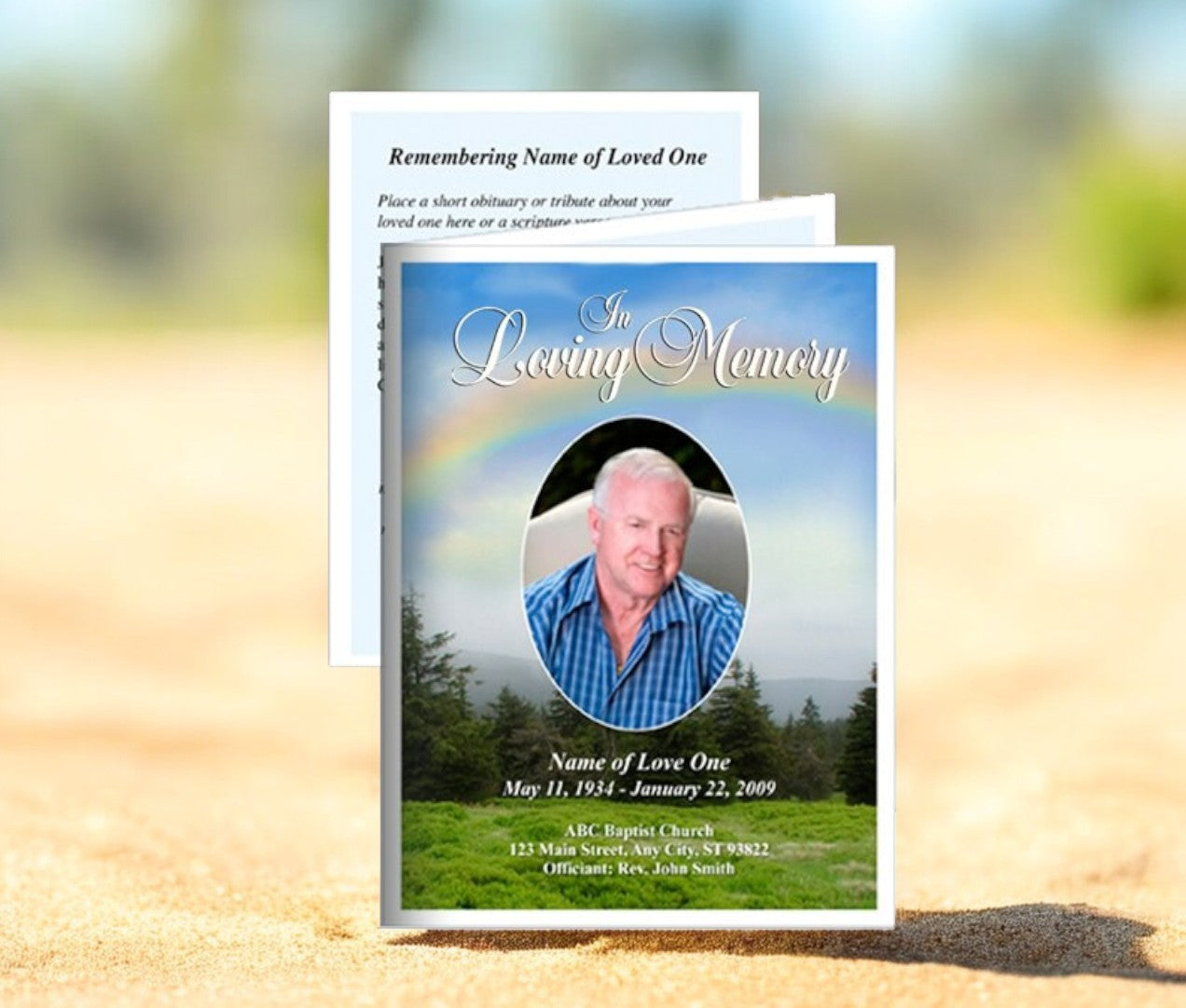 The Promise Small Memorial Card Template beautifully symbolizes the promise of hope and eternal life through its vibrant rainbow design on the cover. The rainbow serves as a powerful reminder of faith and the belief in a life beyond death, offering comfort and solace to those who mourn. The bright colors and uplifting imagery evoke feelings of peace, while providing a hopeful tribute to a loved one’s journey.