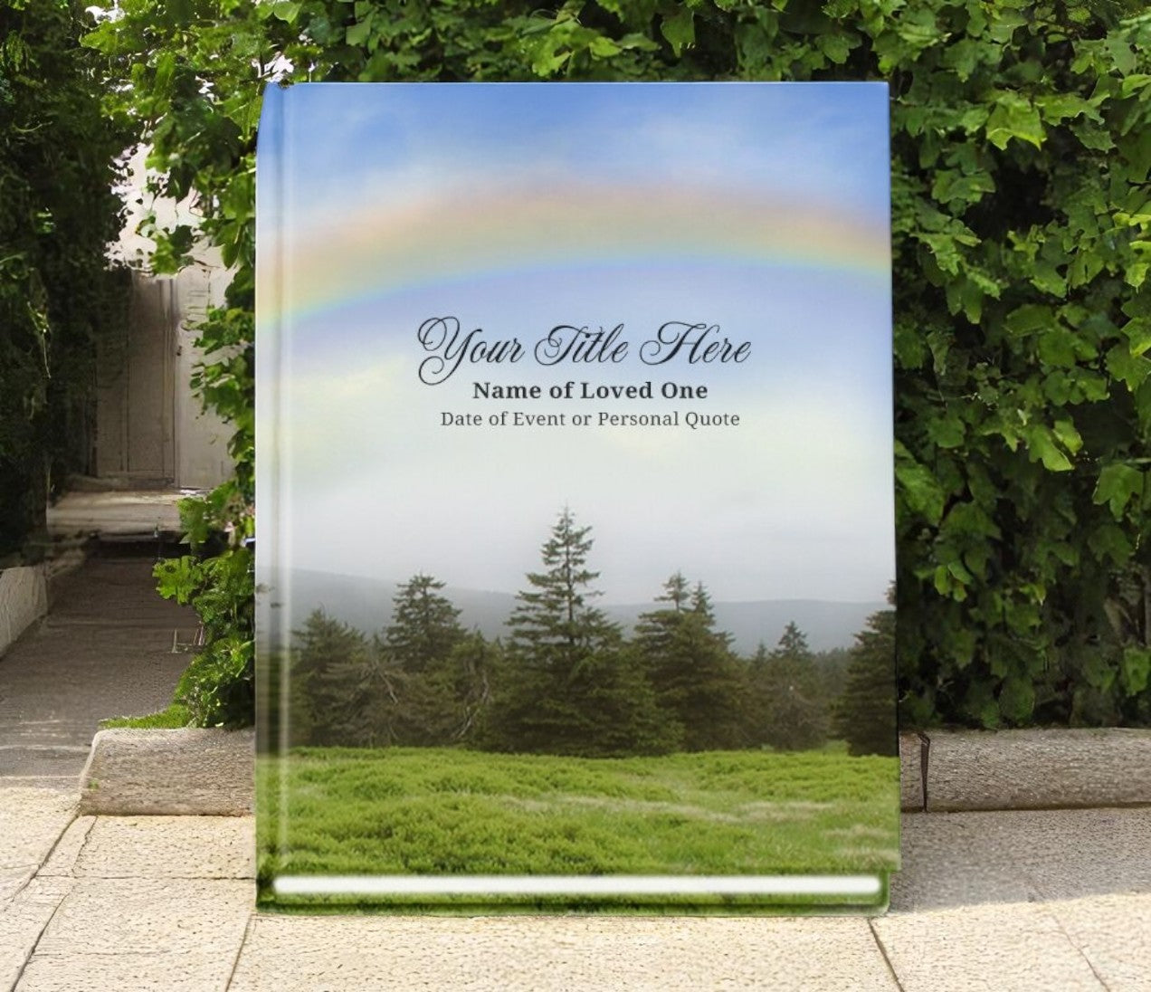 The Promise Funeral Guest Book features the beauty and grandeur of a natural outdoor wooded setting, with the promise of a rainbow in the crisp blue sky. This lovely design offers a peaceful space for guests to leave their heartfelt messages, creating a comforting atmosphere during a memorial service. The serene outdoor setting and the promise of the rainbow in the Promise Funeral Guest Book symbolize hope, renewal, and the beauty of life beyond.