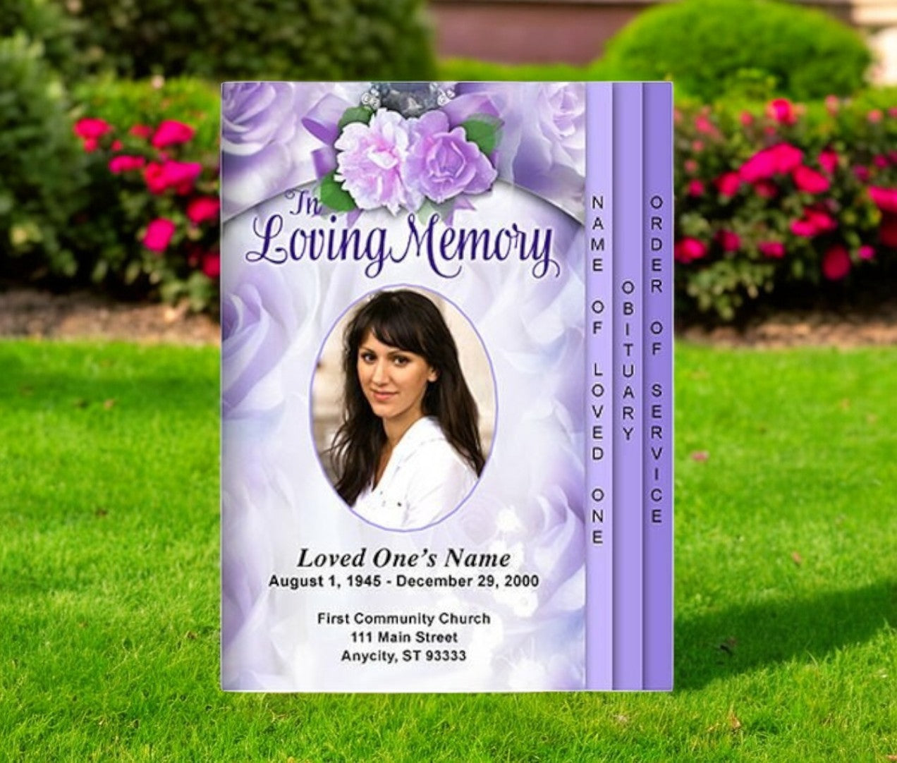 The Rapture 8-Sided Graduated Program Template features an elegant lavender rose background adorned with a graceful arched floral embellishment. This beautifully designed template exudes warmth and serenity, making it a perfect tribute to honor a loved one’s memory. The soft lavender tones symbolize love, remembrance, and peace, creating a heartfelt and visually stunning presentation that serves as a cherished keepsake for family and friends.