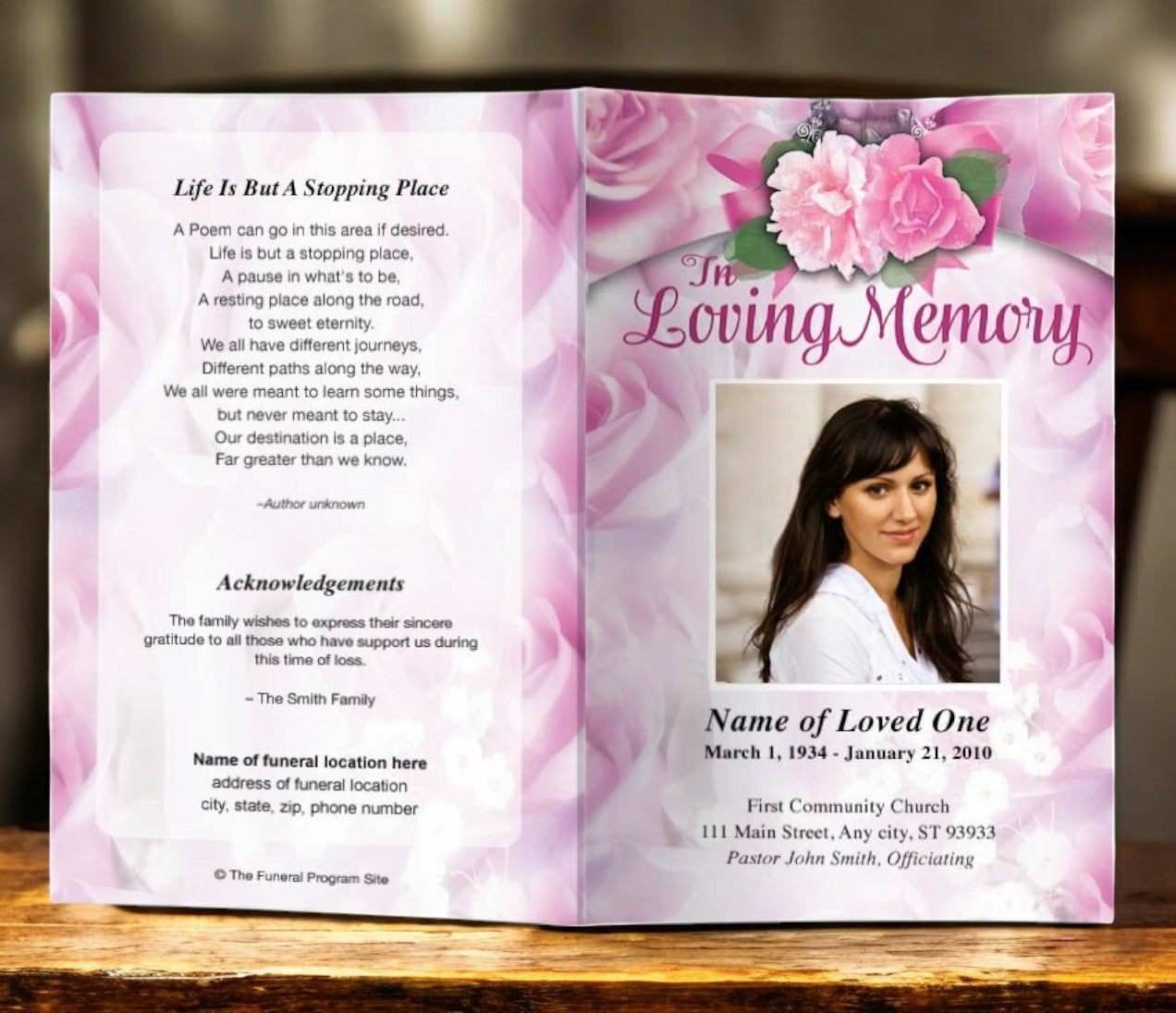 An elegant and soft lovely rose background with arched floral embellishments sets the mood for this program template. The back of the funeral program continues with a coordinating background design with white transparent overly that is perfect for a poem or short obituary/biography. The inside displays a complimentary background layout design with white framed content area.