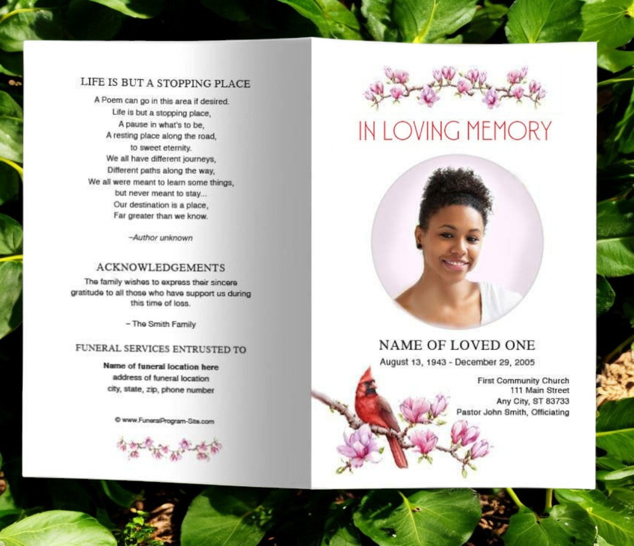 The white, clean background for our red cardinal design is the perfect presentation for your next funeral program. A watercolor red cardinal sits upon a branch with cherry blossoms buds with a border of cherry blossoms to complete the look.