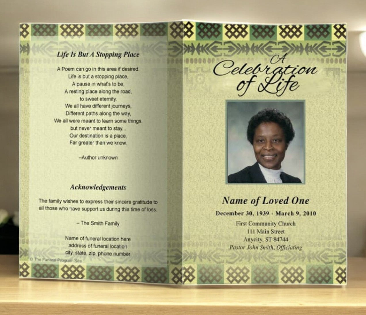 This obituary funeral program template is adorned and trimmed with cultural symbols and emblems at the top and bottom of the program. The back of the funeral program continues a similar background design with white transparent overly. The inside displays a complimentary background design with white inset framed content area.
